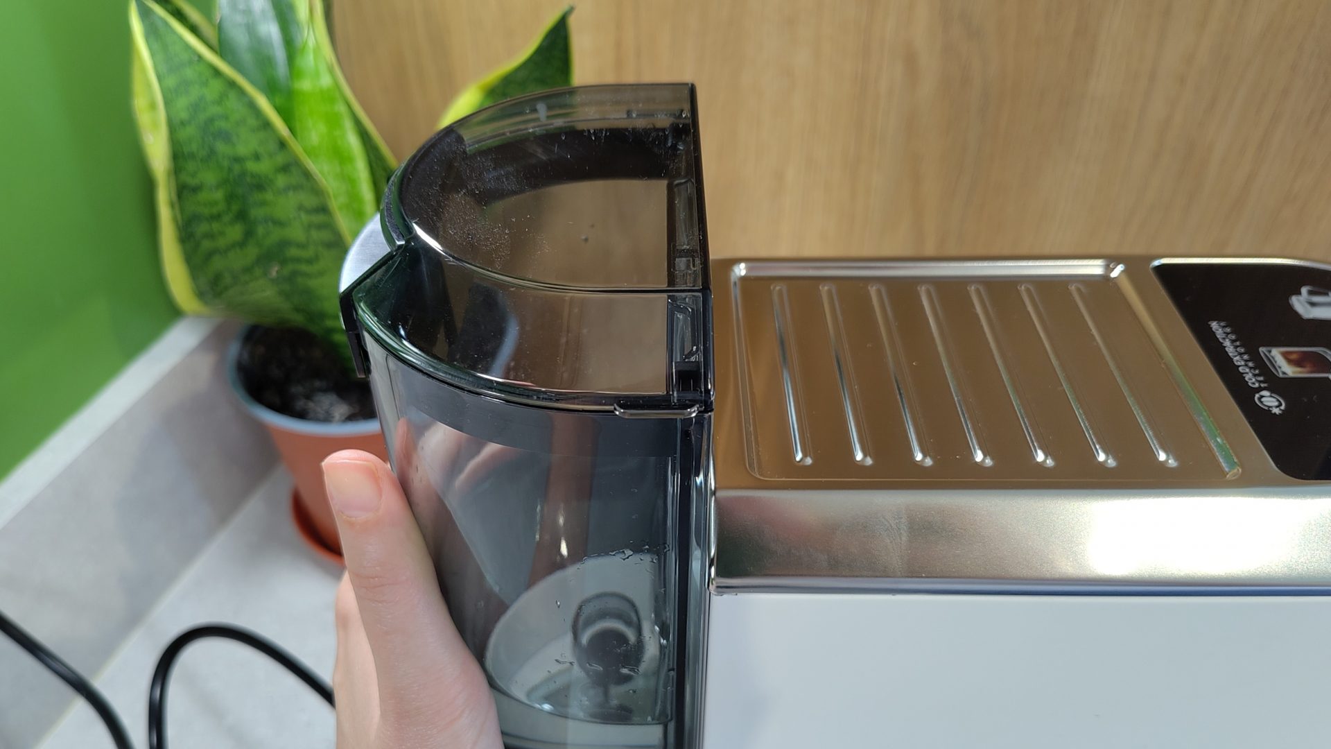 Резервуар для воды крепится сзади и имеет прочную откидную крышку для сохранения свежести воды. В него также можно установить дополнительный фильтр для воды, который приобретается отдельно. Резервуар легко снимается и устанавливается на место. Для этого вам понадобится отодвинуть машину от стены, но она настолько маленькая и легкая, что это не составит проблемы.