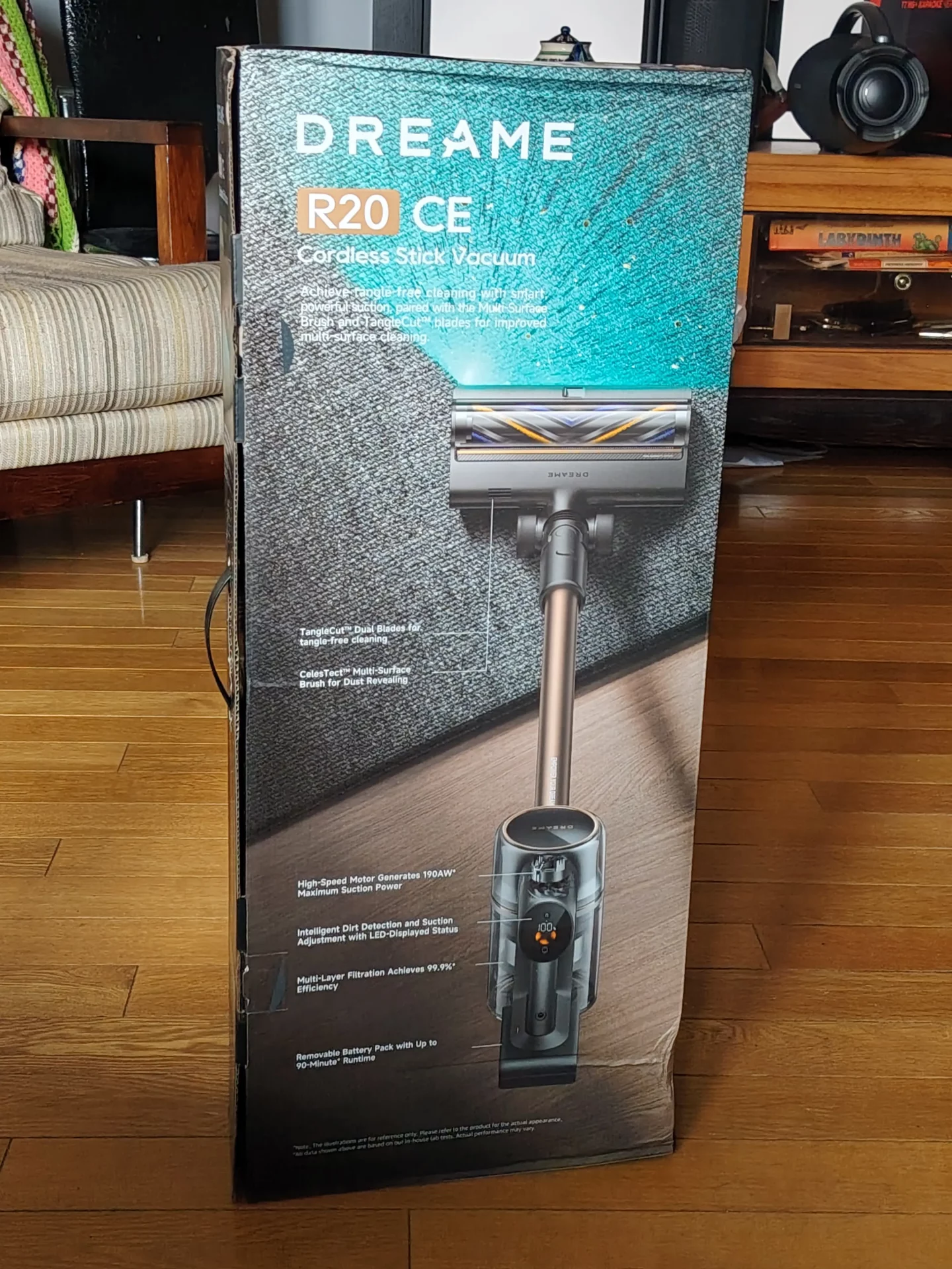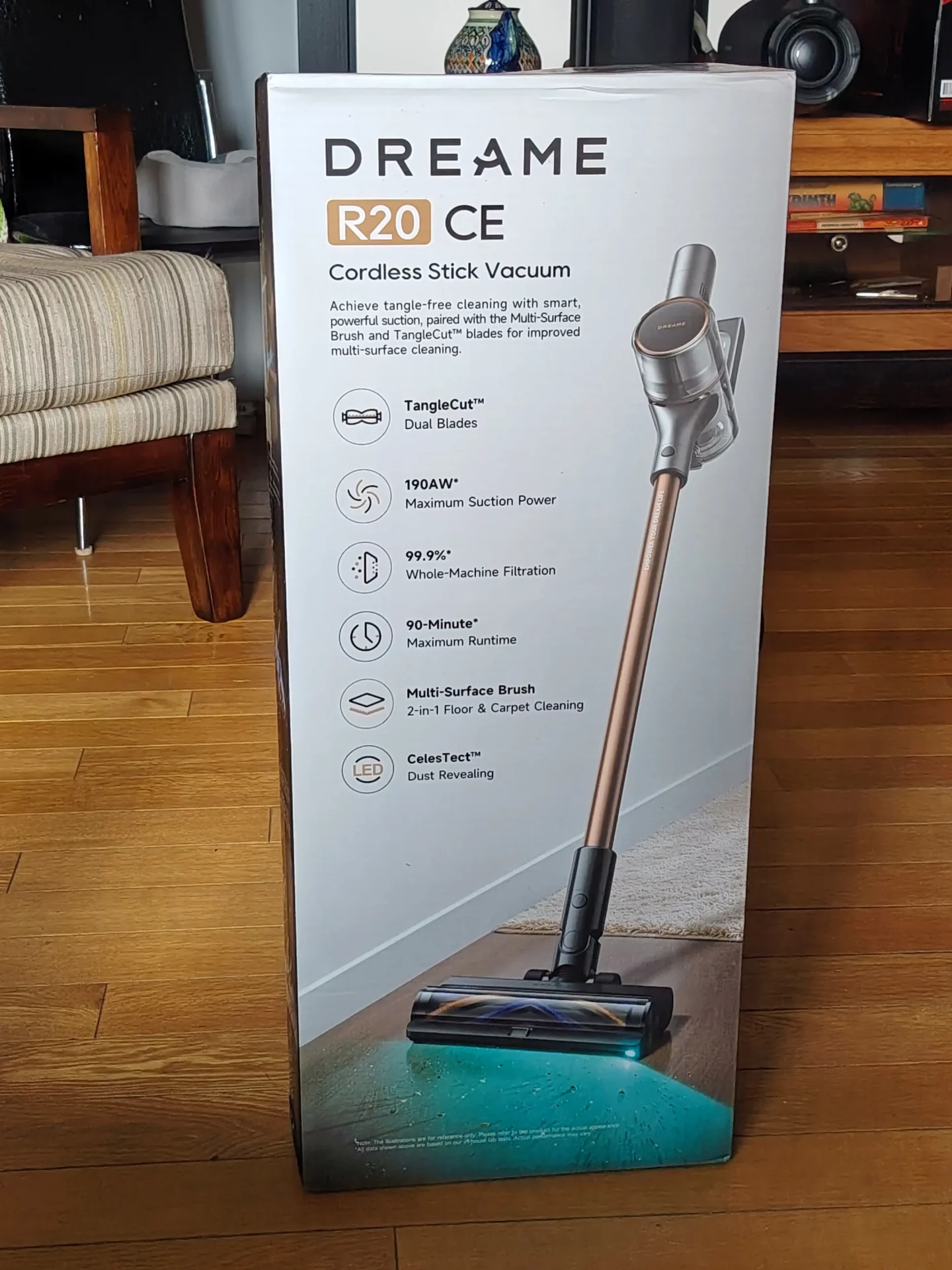 Разберем ключевые преимущества этого аппарата. Dreame R20 CE создан для тщательной уборки в каждом уголке вашего дома. Производитель обещает высокую мощность всасывания — 190 аэроватт, защиту от наматывания волос с помощью TangleCut™ и многофункциональную щетку с технологией CelesTect™, помогающую лучше видеть пыль на полу и эффективно очищать ковры и твердые покрытия.