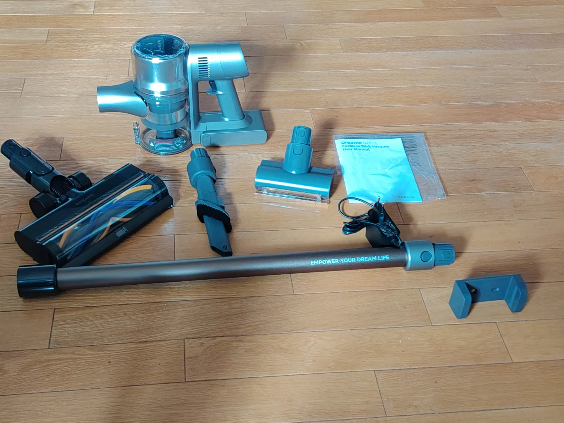 Я сразу решила проверить, насколько удобно его хранить. Достала настенный держатель, прикрутила к стене и подключила к нему шнур (длины в 1,5 метра хватит до розетки с головой). Фишка в том, что пылесос начинает заряжаться сразу, как только ты вешаешь его на базу. Плюс на самом держателе есть места для хранения насадок. Собирается пылесос интуитивно, все детали защелкиваются плотно, он с резиновыми уплотнителями.