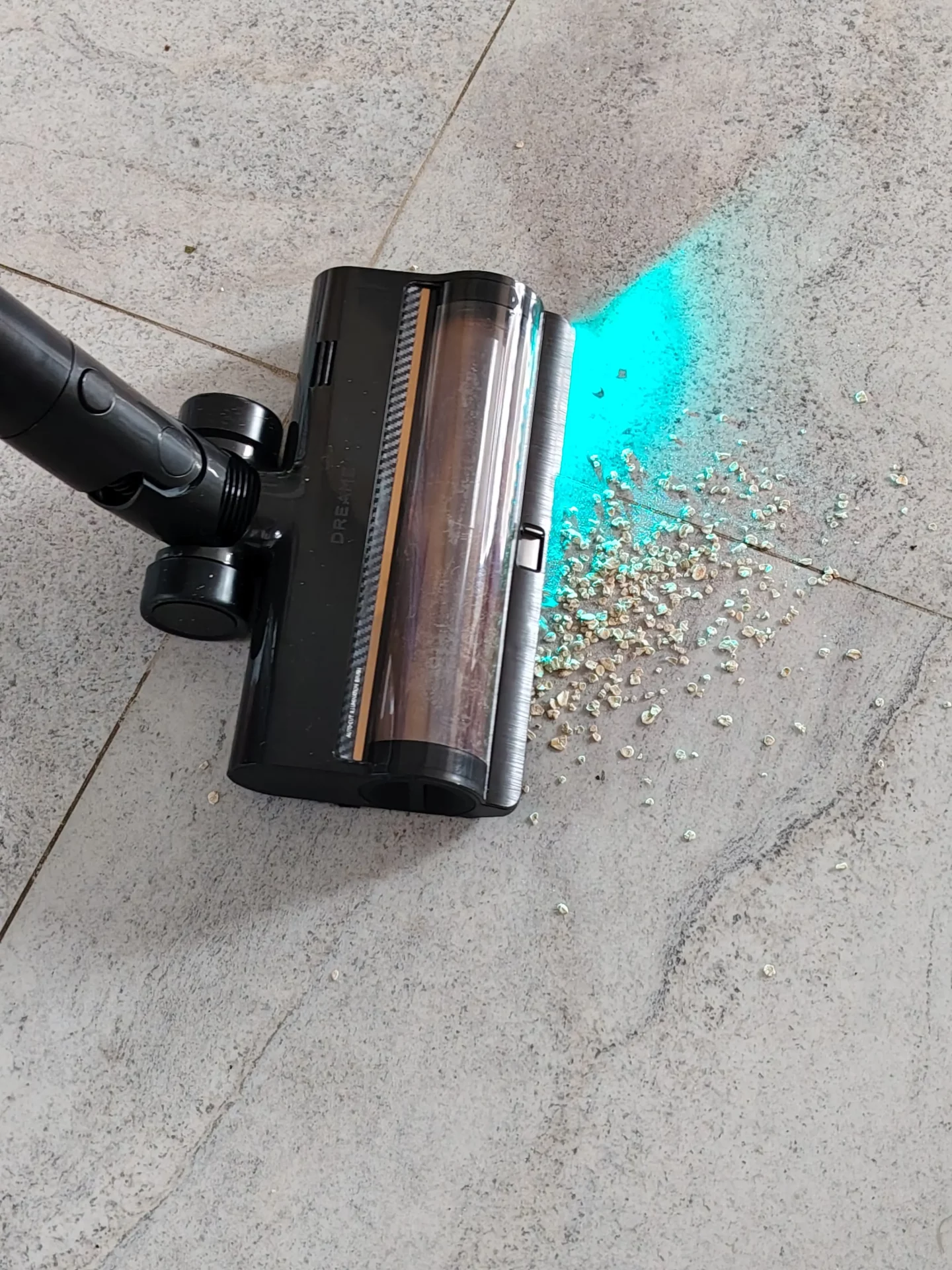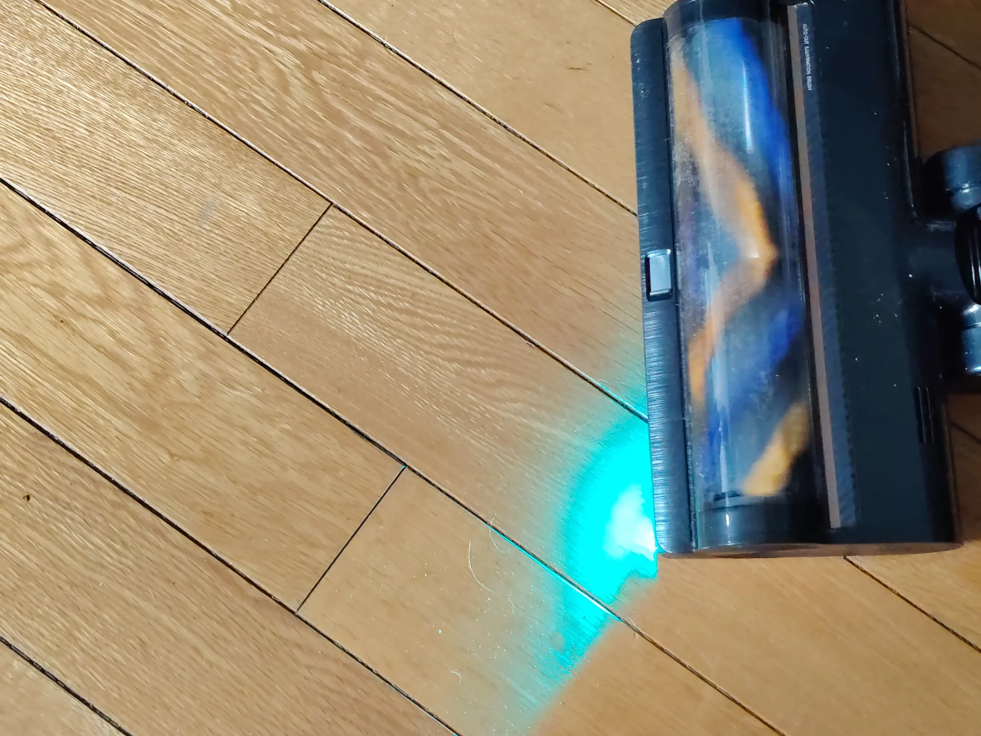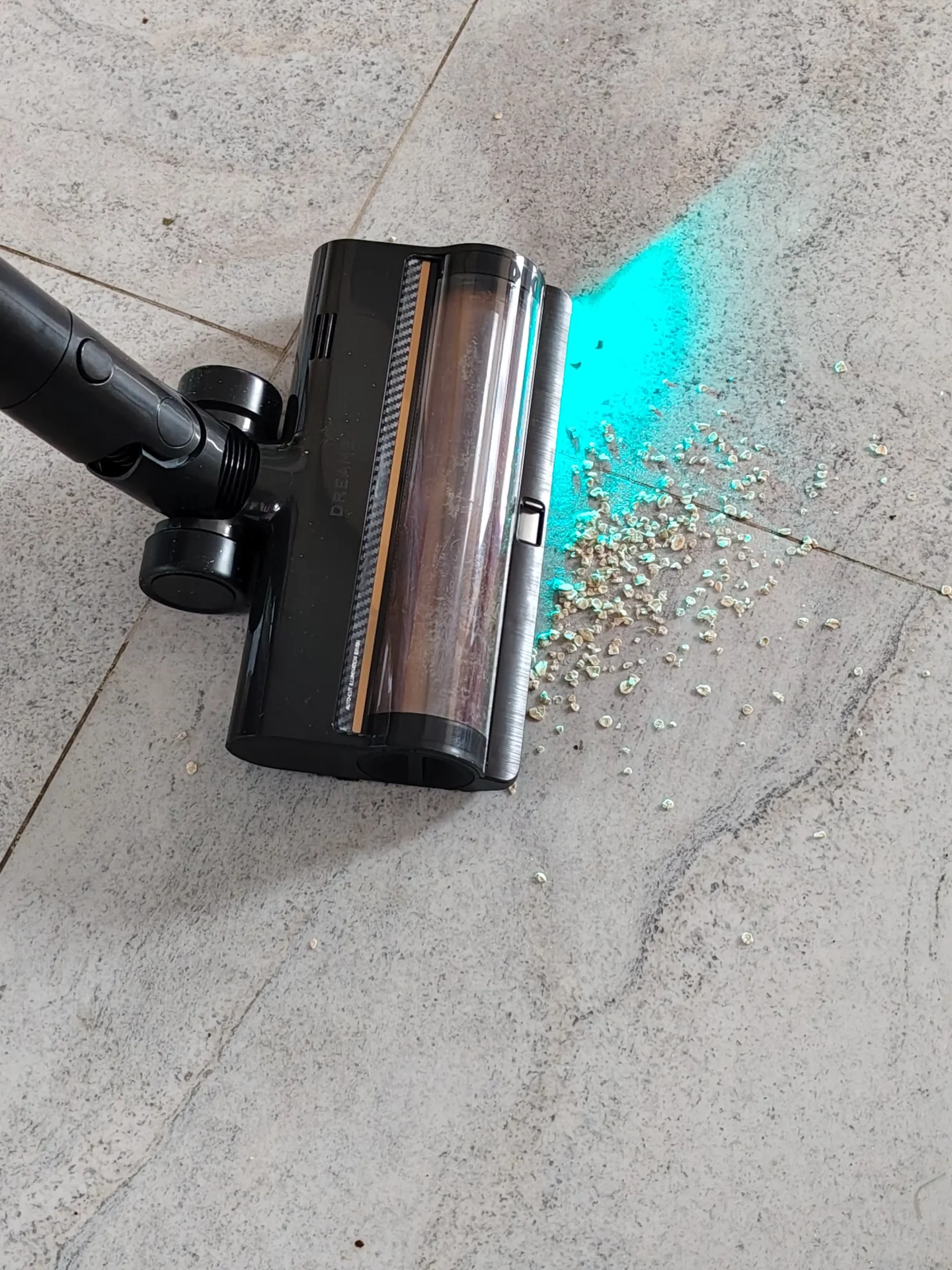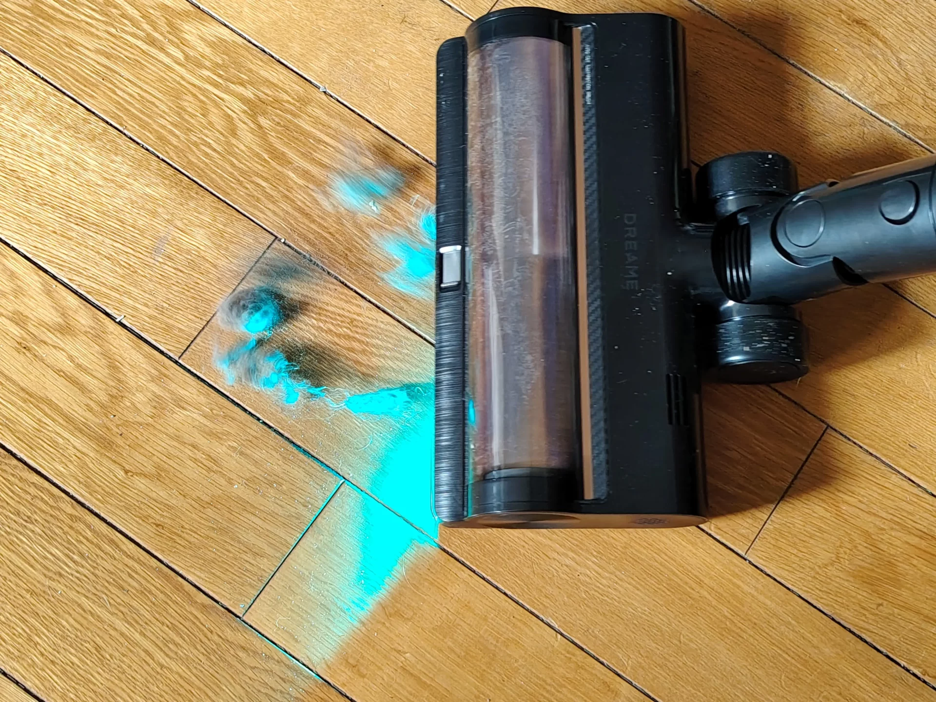Я дождалась вечера, выключила свет на кухне и пошла пылесосить. Синий свет от щетки моментально подсветил на полу пыль и крошки. Я легко маневрировала между ножками кухонных стульев. Спереди на щетке есть переключатель (шторка): я открыла его, чтобы протестировать сбор крупного мусора, и пылесос без проблем заглотил рассыпанные хлопья. Единственный нюанс, который я выявила в тесте — по бокам щетки есть «слепые зоны» из-за креплений роллера (8 мм справа и 20 мм слева). Поэтому вдоль плинтусов я вела пылесос именно правой стороной вплотную к стене.
