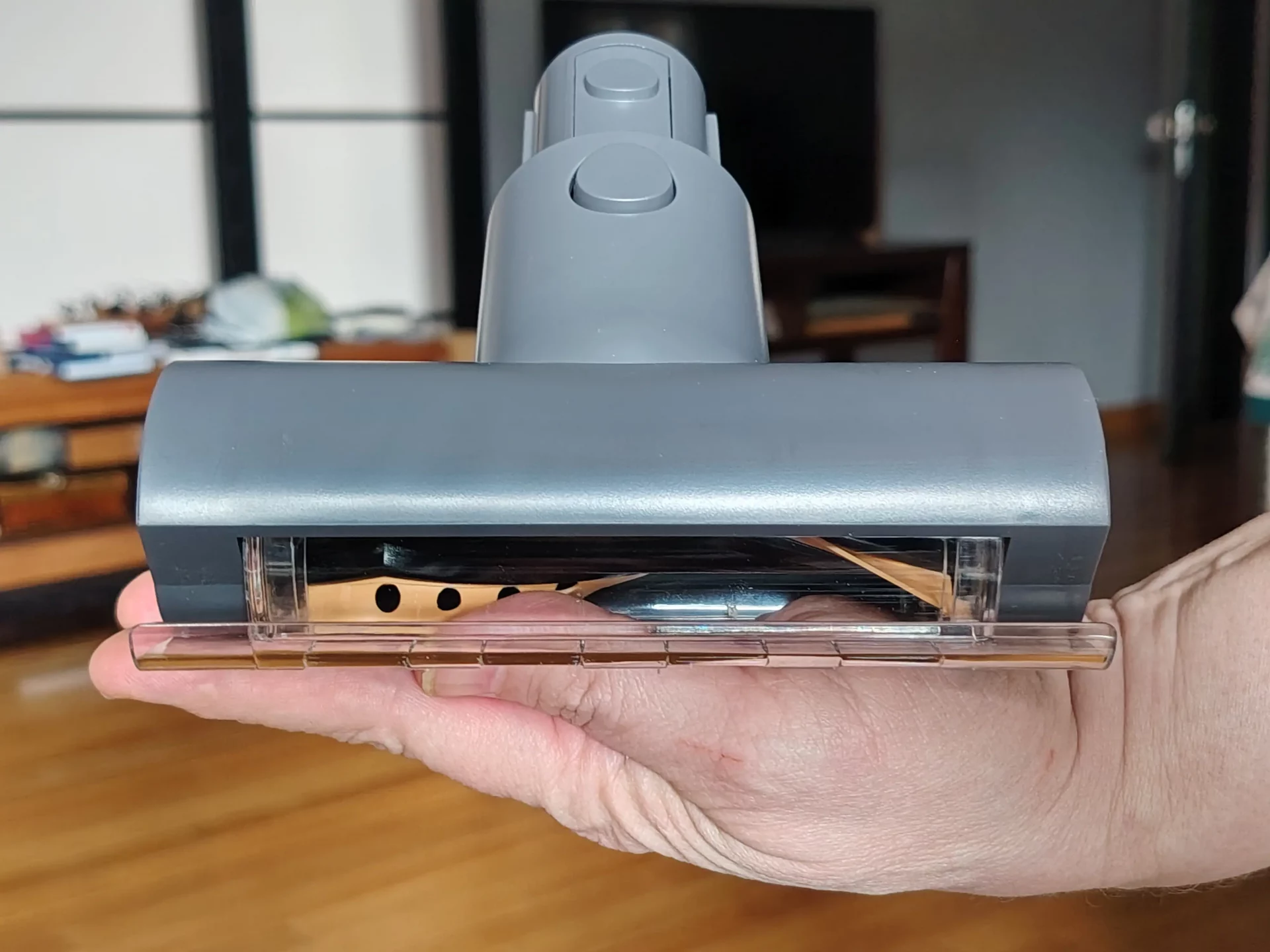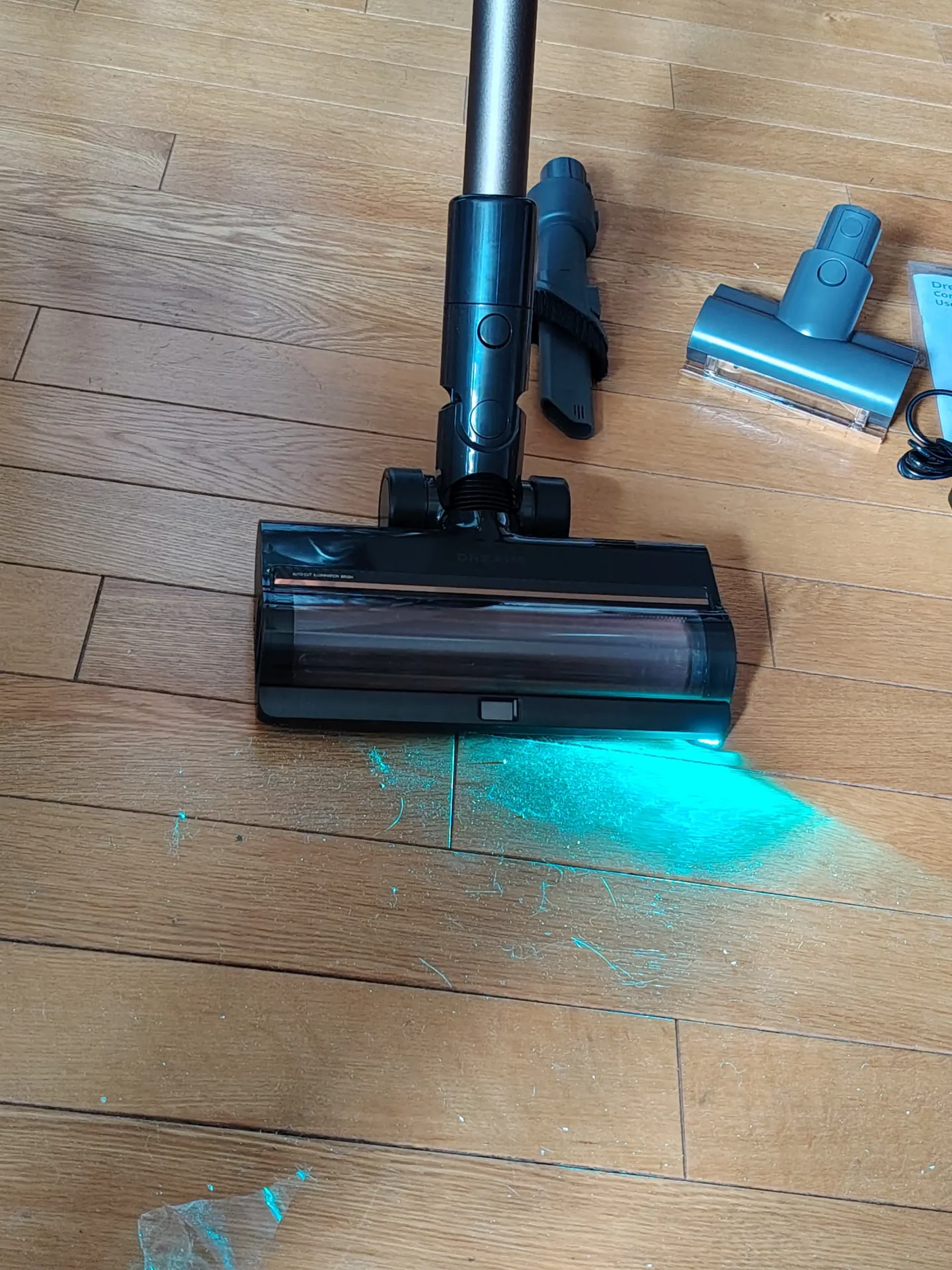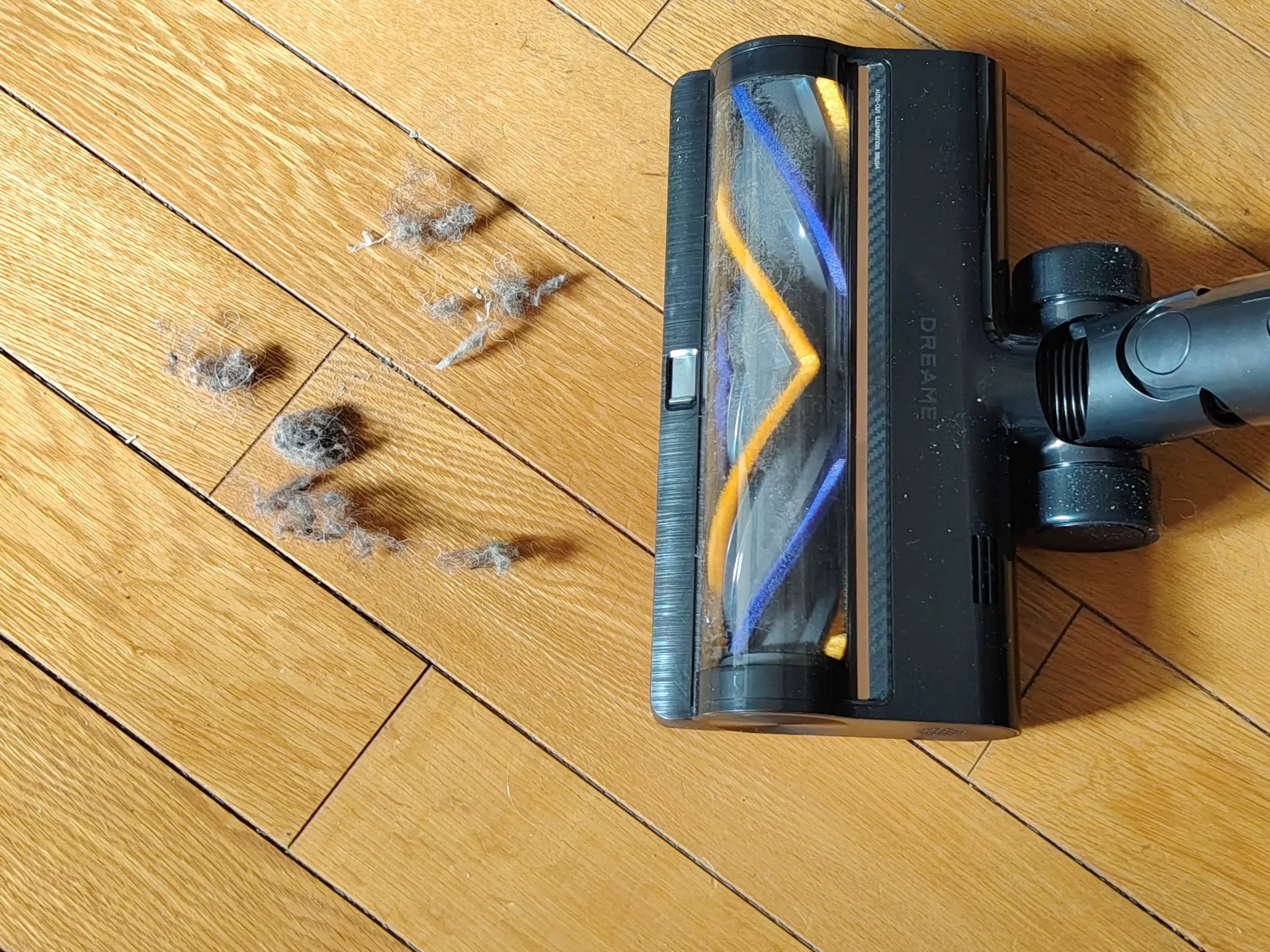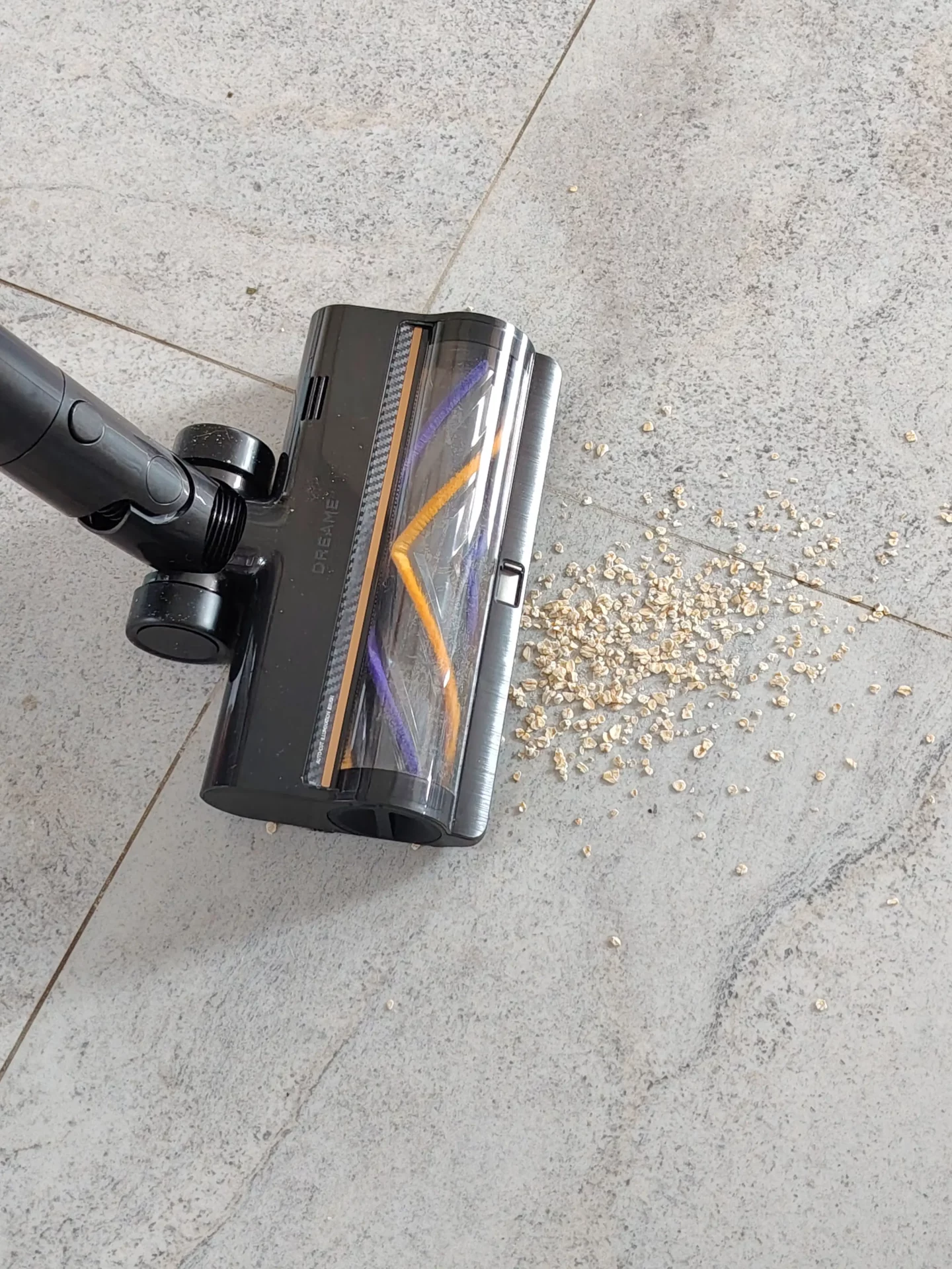 Я дождалась вечера, выключила свет на кухне и пошла пылесосить. Синий свет от щетки моментально подсветил на полу пыль и крошки. Я легко маневрировала между ножками кухонных стульев. Спереди на щетке есть переключатель (шторка): я открыла его, чтобы протестировать сбор крупного мусора, и пылесос без проблем заглотил рассыпанные хлопья. Единственный нюанс, который я выявила в тесте — по бокам щетки есть «слепые зоны» из-за креплений роллера (8 мм справа и 20 мм слева). Поэтому вдоль плинтусов я вела пылесос именно правой стороной вплотную к стене.