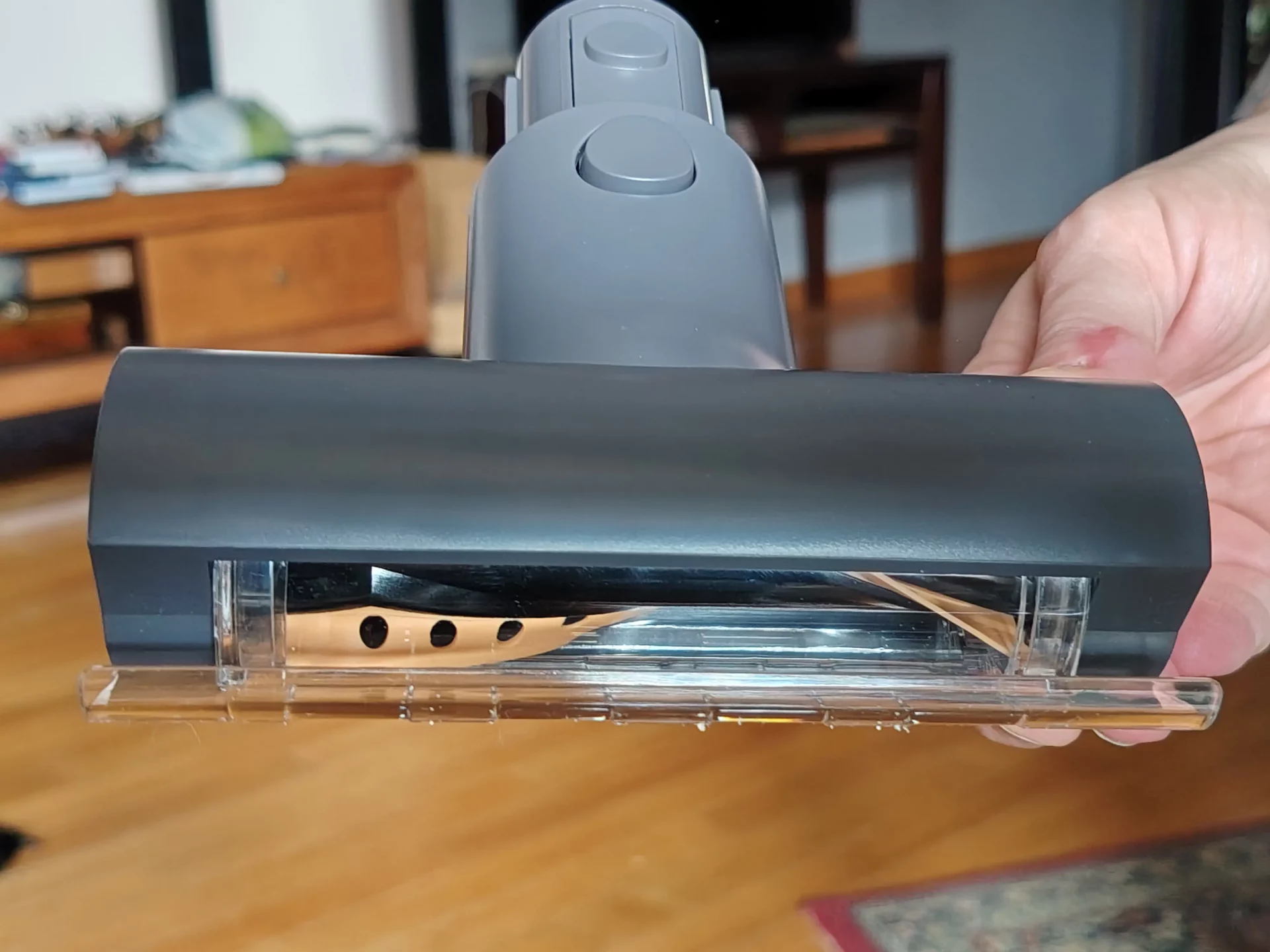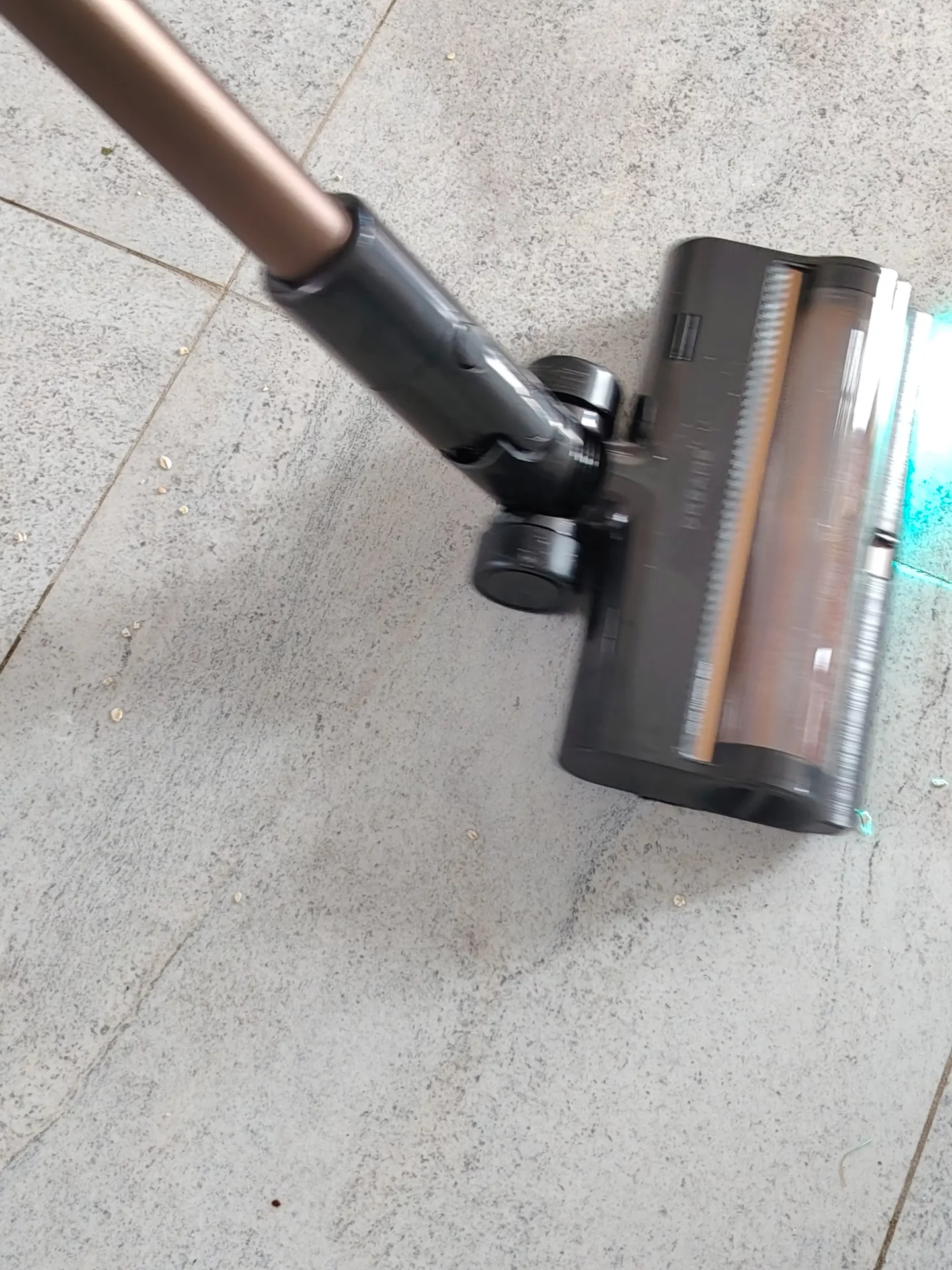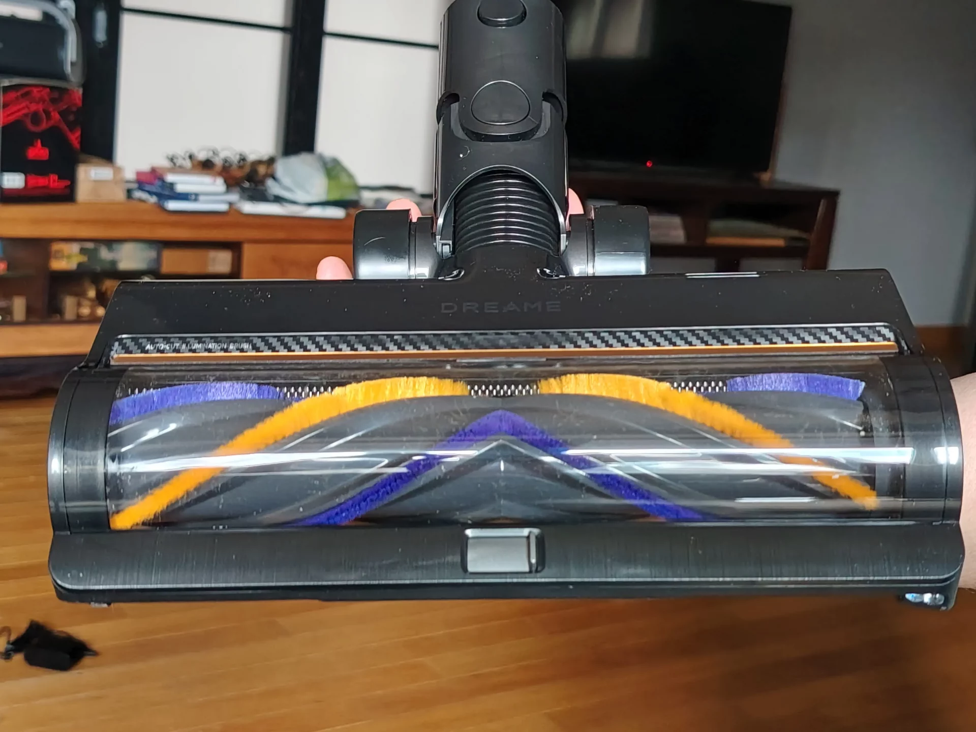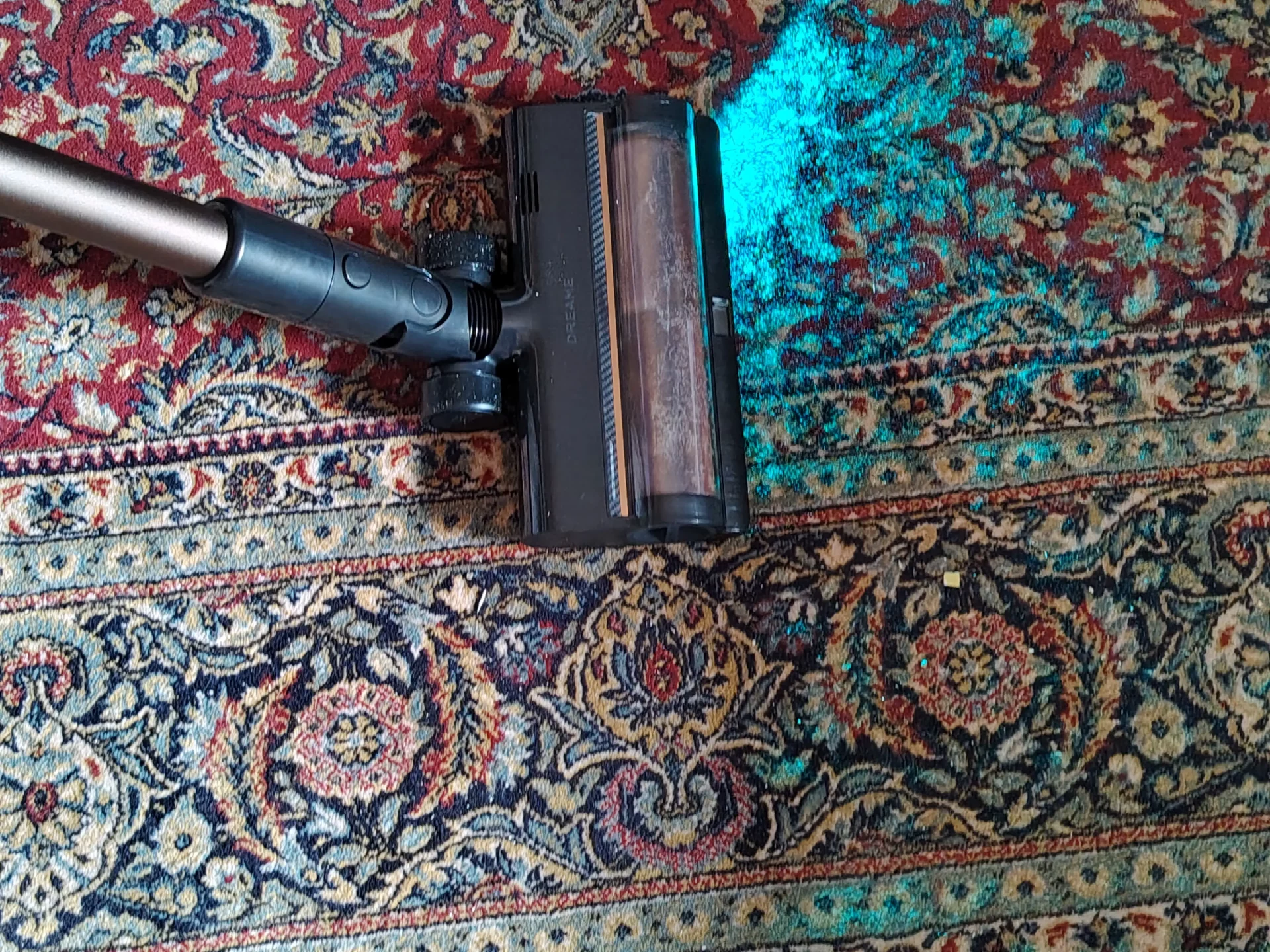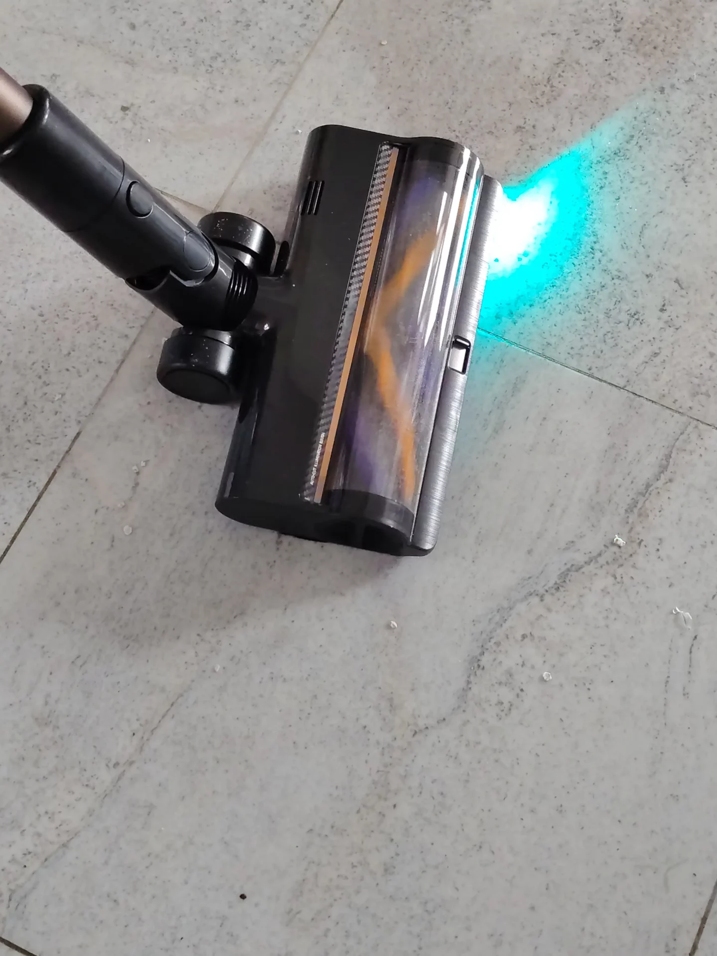 Я дождалась вечера, выключила свет на кухне и пошла пылесосить. Синий свет от щетки моментально подсветил на полу пыль и крошки. Я легко маневрировала между ножками кухонных стульев. Спереди на щетке есть переключатель (шторка): я открыла его, чтобы протестировать сбор крупного мусора, и пылесос без проблем заглотил рассыпанные хлопья. Единственный нюанс, который я выявила в тесте — по бокам щетки есть «слепые зоны» из-за креплений роллера (8 мм справа и 20 мм слева). Поэтому вдоль плинтусов я вела пылесос именно правой стороной вплотную к стене.
