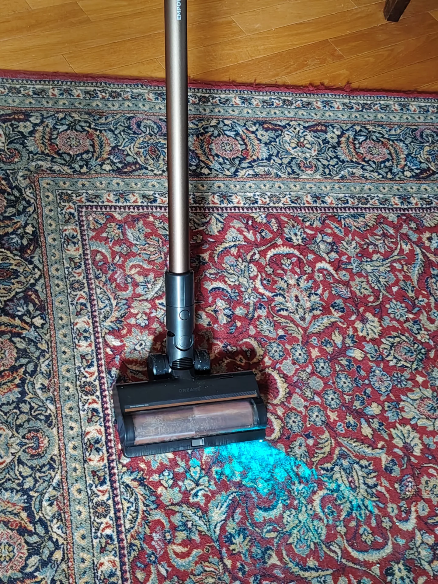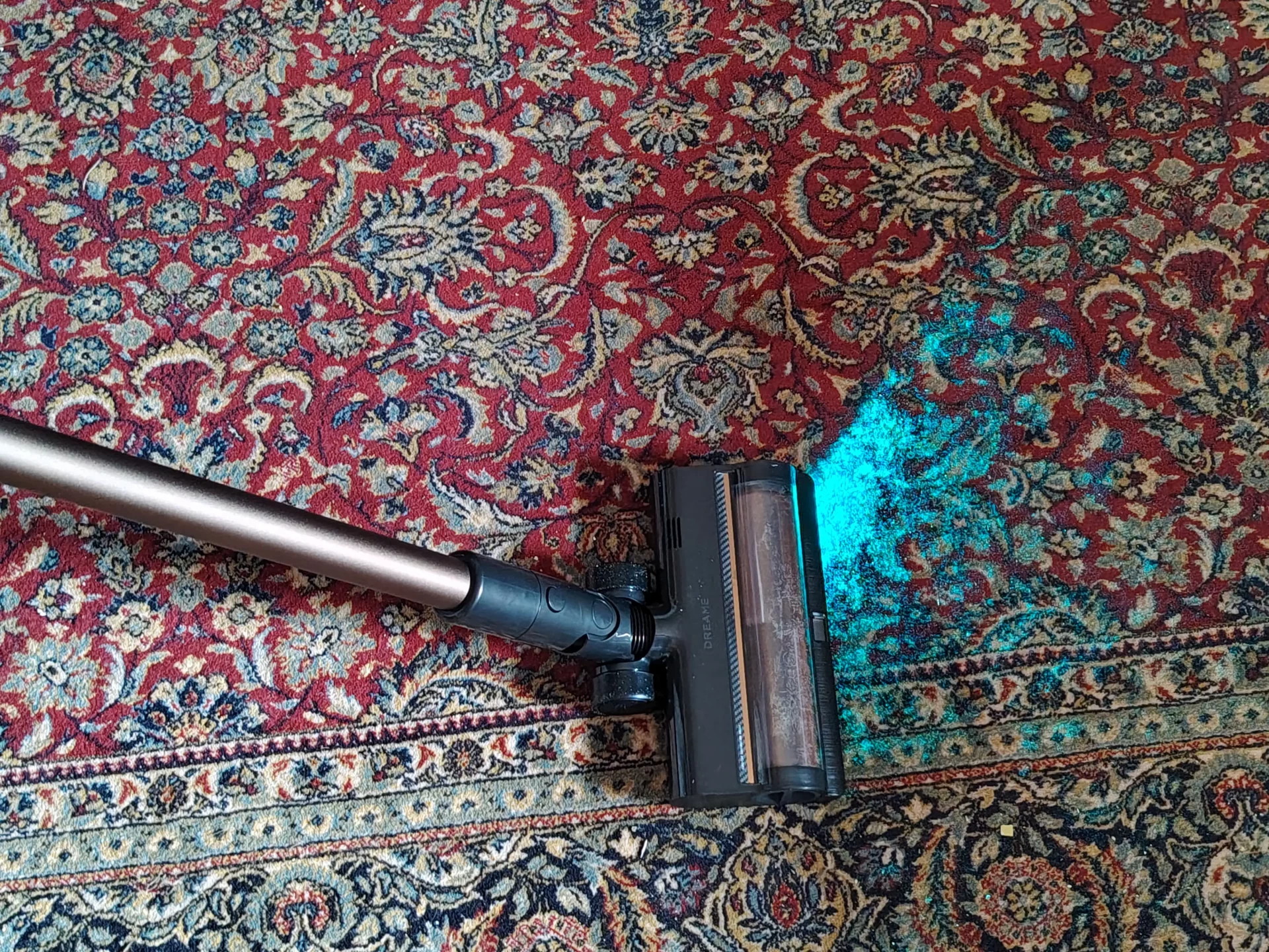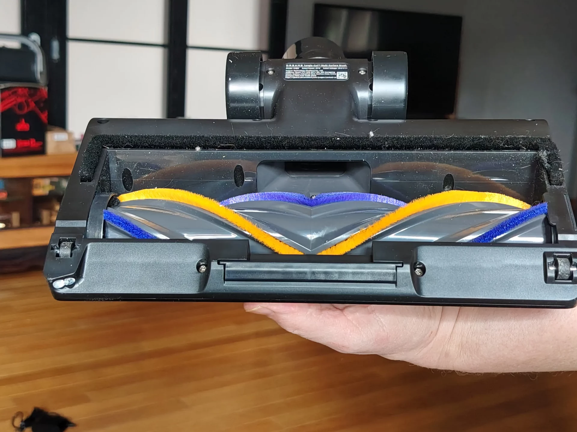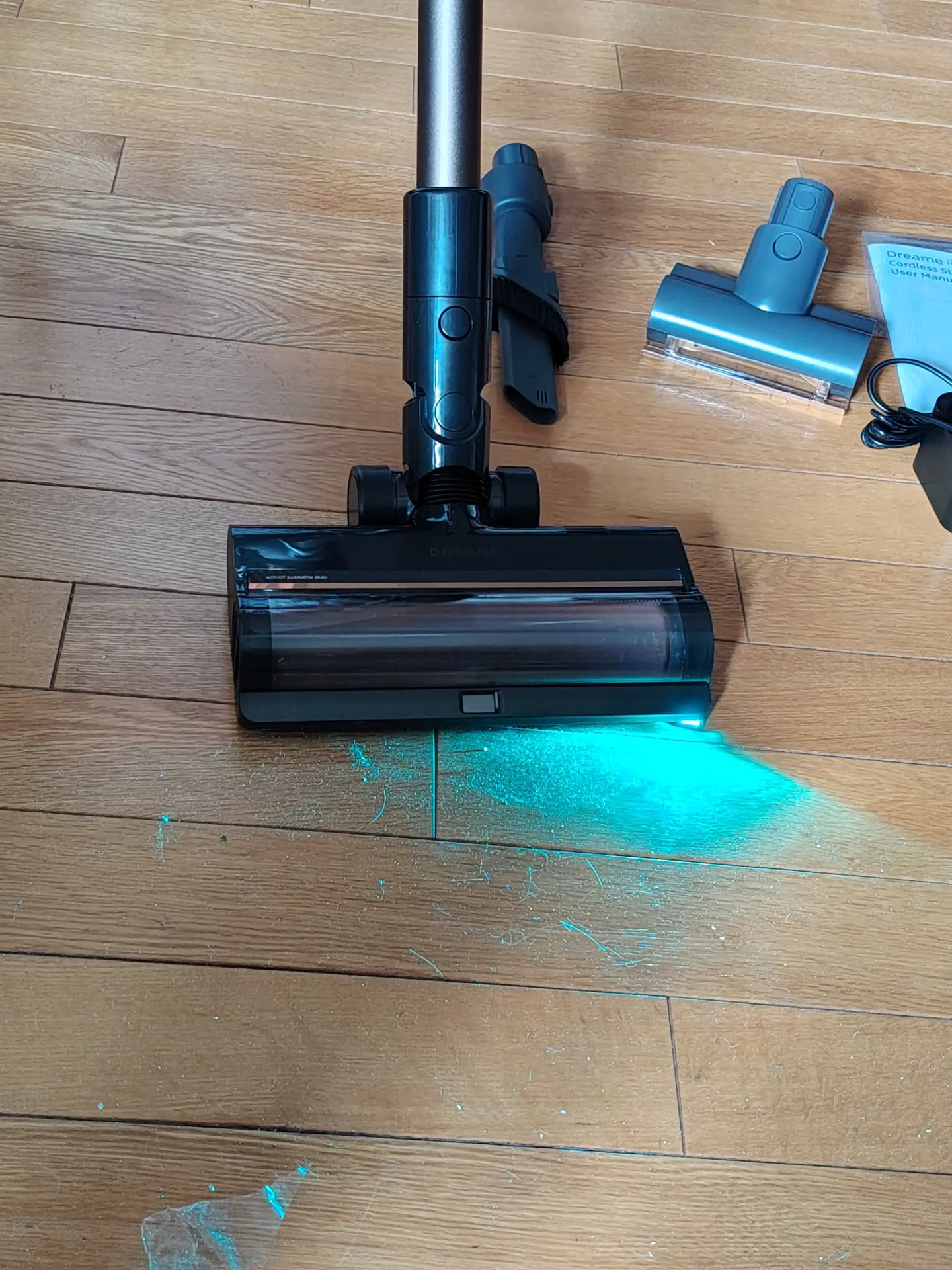 Я дождалась вечера, выключила свет на кухне и пошла пылесосить. Синий свет от щетки моментально подсветил на полу пыль и крошки. Я легко маневрировала между ножками кухонных стульев. Спереди на щетке есть переключатель (шторка): я открыла его, чтобы протестировать сбор крупного мусора, и пылесос без проблем заглотил рассыпанные хлопья. Единственный нюанс, который я выявила в тесте — по бокам щетки есть «слепые зоны» из-за креплений роллера (8 мм справа и 20 мм слева). Поэтому вдоль плинтусов я вела пылесос именно правой стороной вплотную к стене.