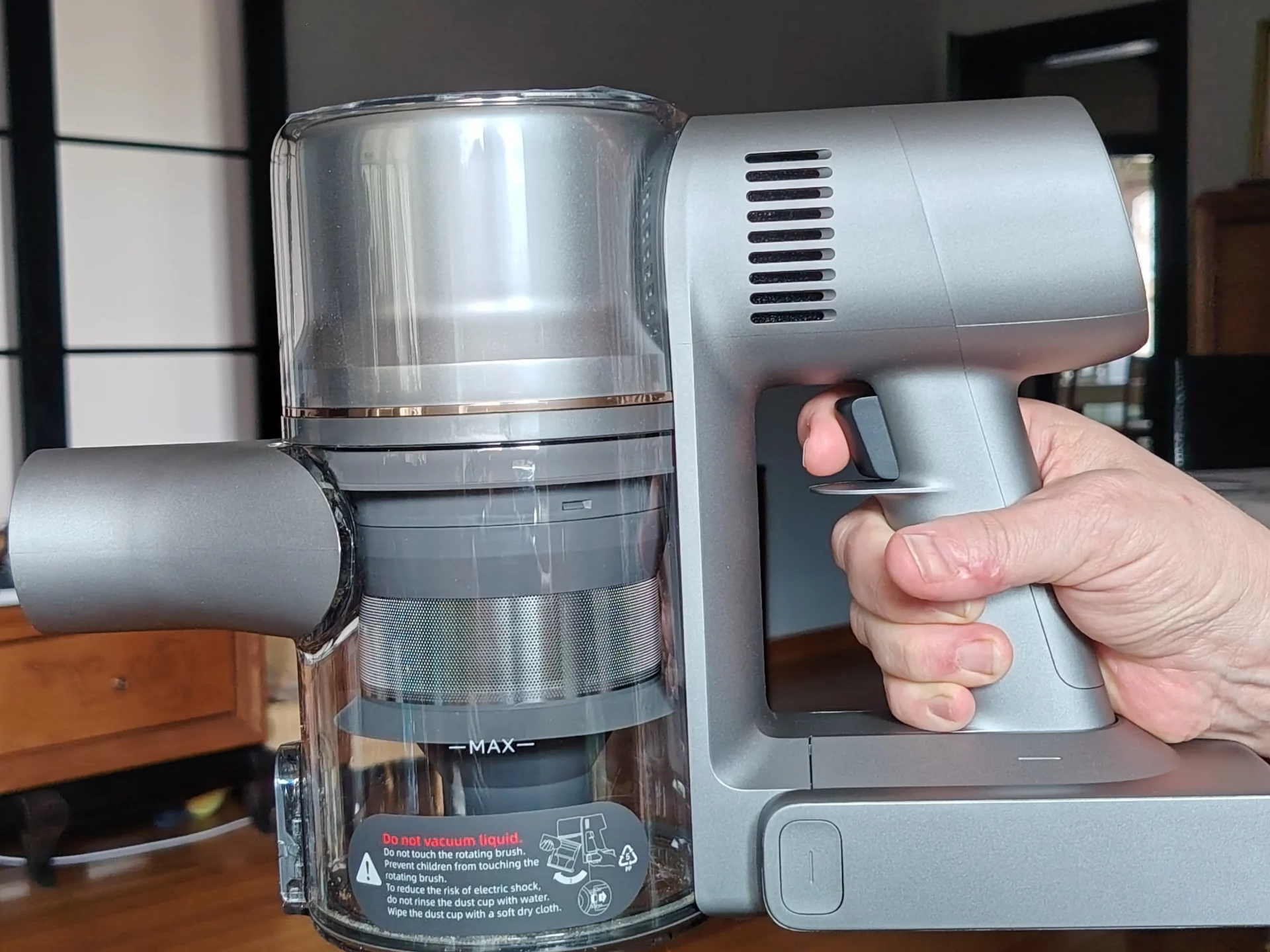 Я пропылесосила весь дом, чтобы оценить нагрузку на руку. Курок у него оказался чувствительным, поэтому тест на блокировку — спасение: я нажала верхнюю кнопку на дисплее, отпустила курок, и пылесос продолжил работать сам. Мой указательный палец и кисть сказали мне огромное спасибо, усталости от веса я не почувствовала вообще.