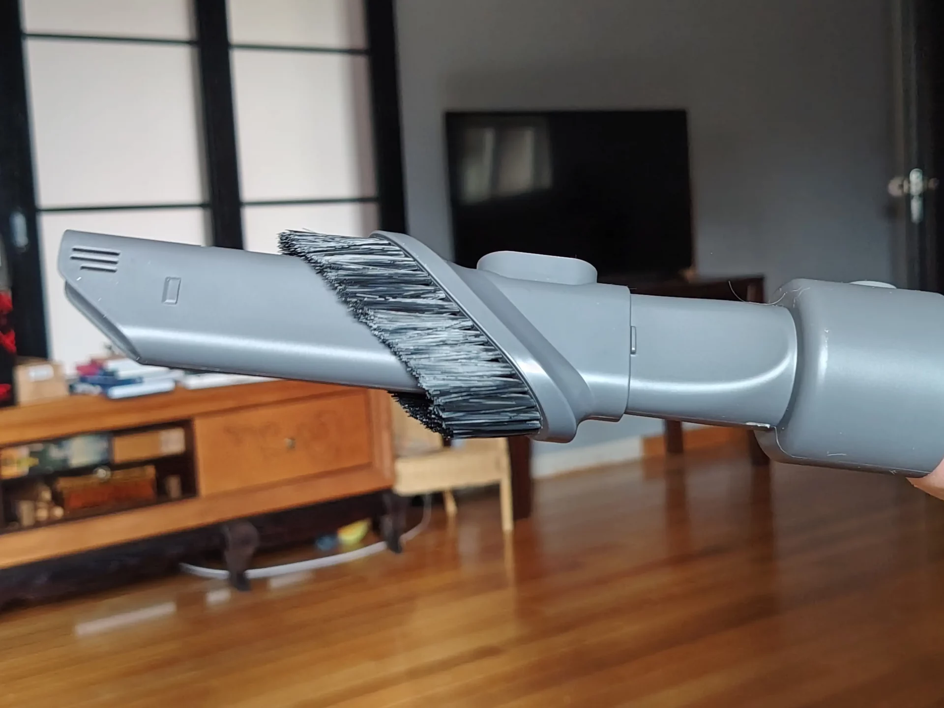 Электрическая мини-щетка имеет защиту от наматывания шерсти и волос для эффективной уборки. Она так просто очистила мебель и собачью лежанку от шерсти — моя главная боль закрыта! Комбинированной насадкой я прошлась буквально везде — легко убрала пыль со столов, подоконников, полок, окон и дверей. Теперь не нужно лишний раз развозить грязь мокрой тряпкой, можно начисто протереть поверхности после пылесоса.