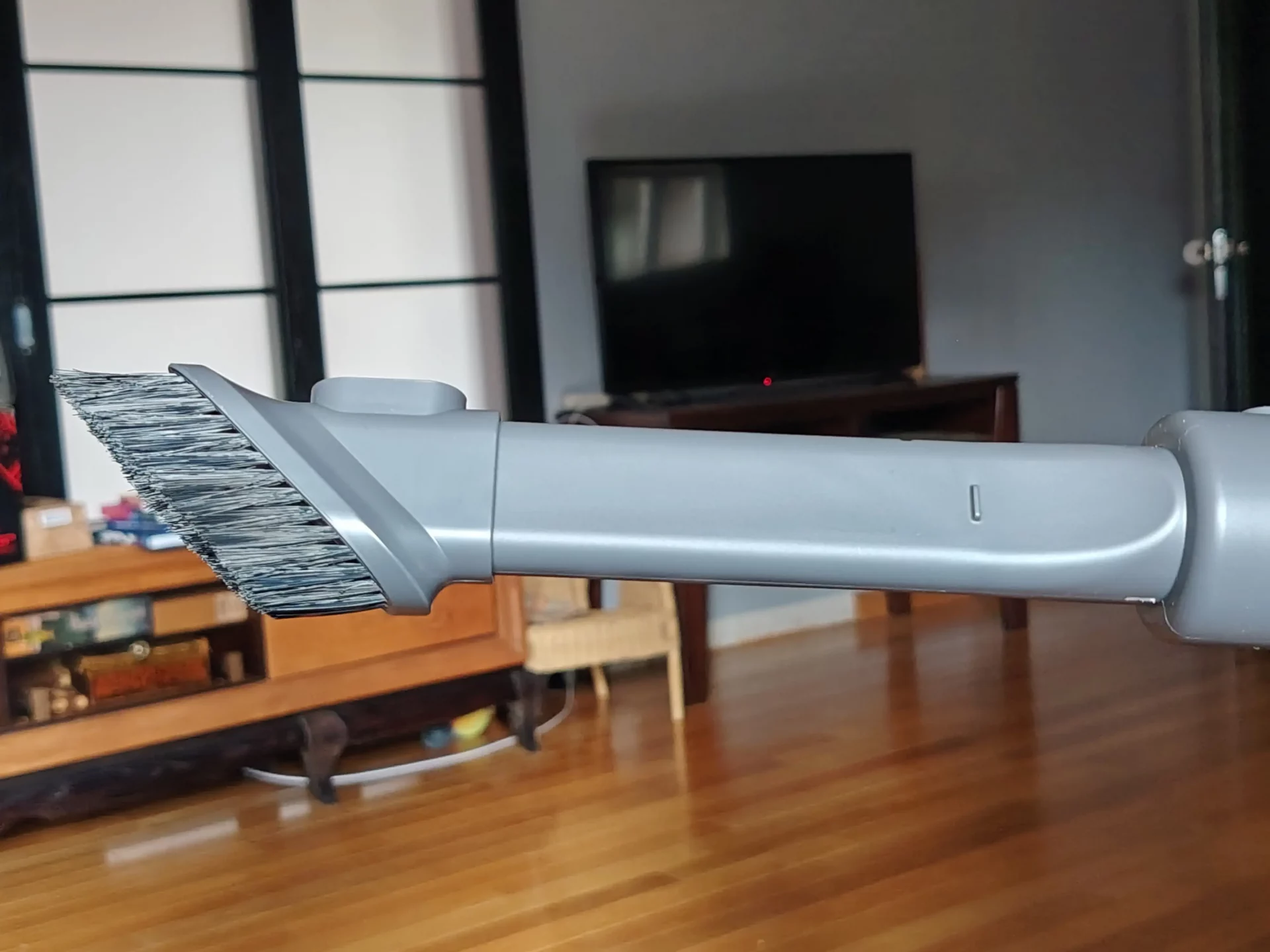 Я устроила пылесосу тест-драйв на коврах, мягкой мебели, плитке и паркете. Рассыпала на кухне овсяные хлопья и накрошила печенье, убрала им останки резиновой собачьей игрушки и прошлась по любимым местам питомца. Так вот, одна щетка эффективна на разных типах покрытий — для базовых сценариев насадку можно не менять! Ей одинаково нипочем паркетная доска и ковры, а крупный мусор легко засасывается благодаря регулировке входного отверстия.