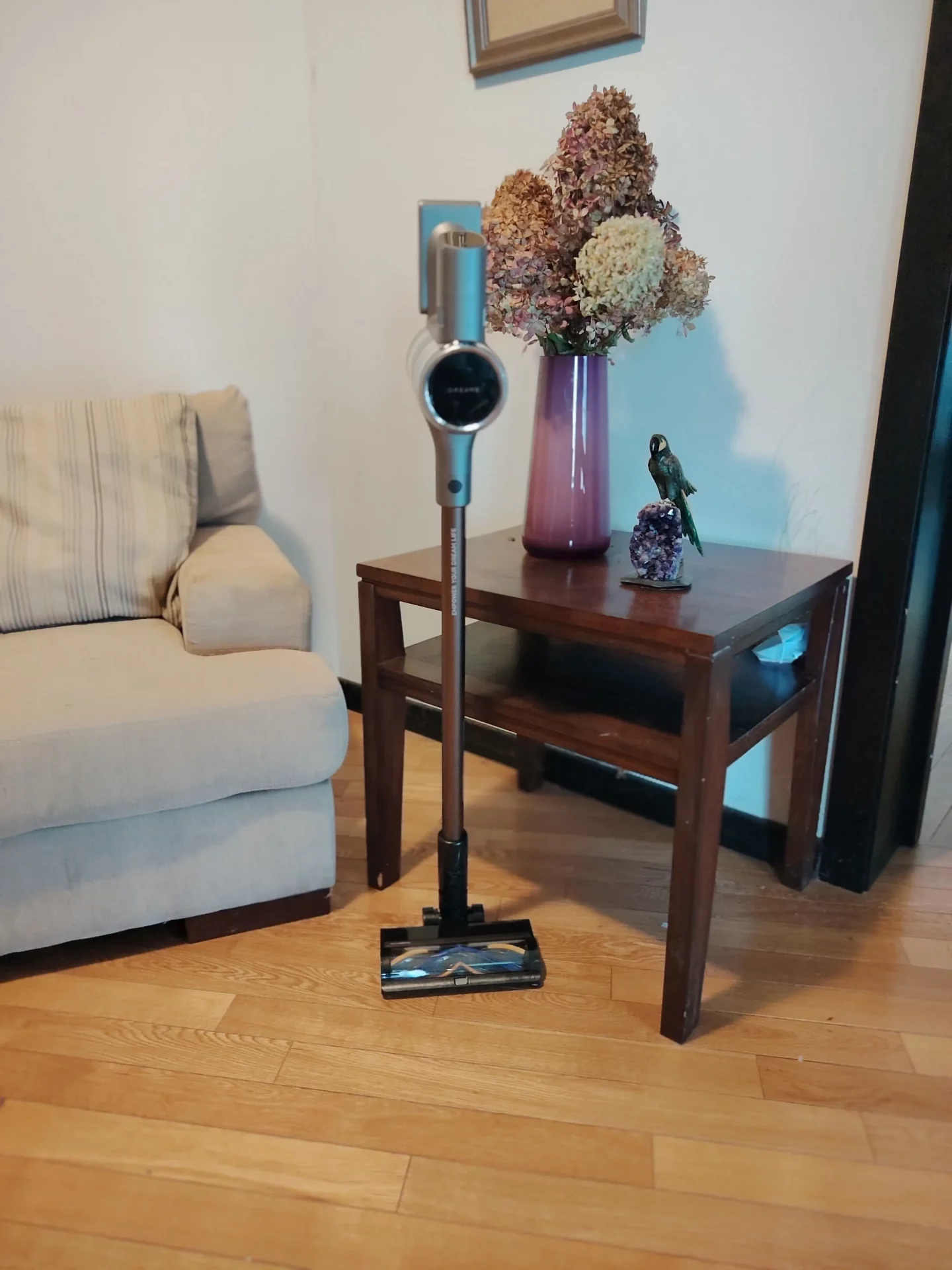 Скажу прямо: по качеству сборки и фишкам он дышит в спину премиальным Dyson и Miele, но стоит в разы дешевле. У него отличная эргономика, съемный аккумулятор, который можно заряжать как на базе, так и просто воткнув шнур в ручку. Наверху расположен классный цветной ЖК-дисплей.