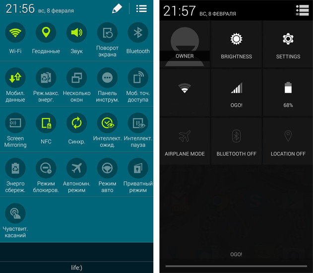 Выключатели в шторках Galaxy S5 (слева) и Droid Turbo. Разница огромна