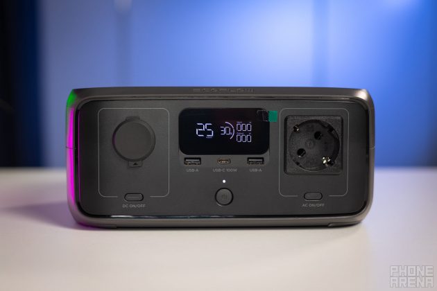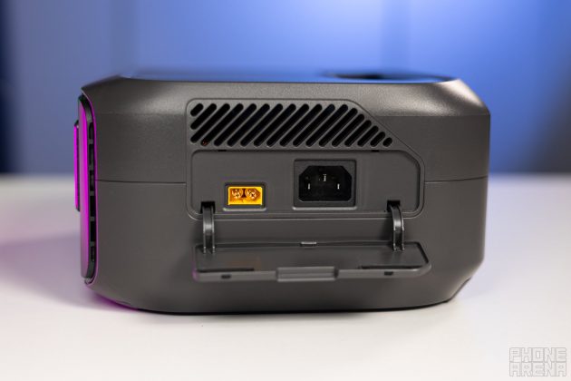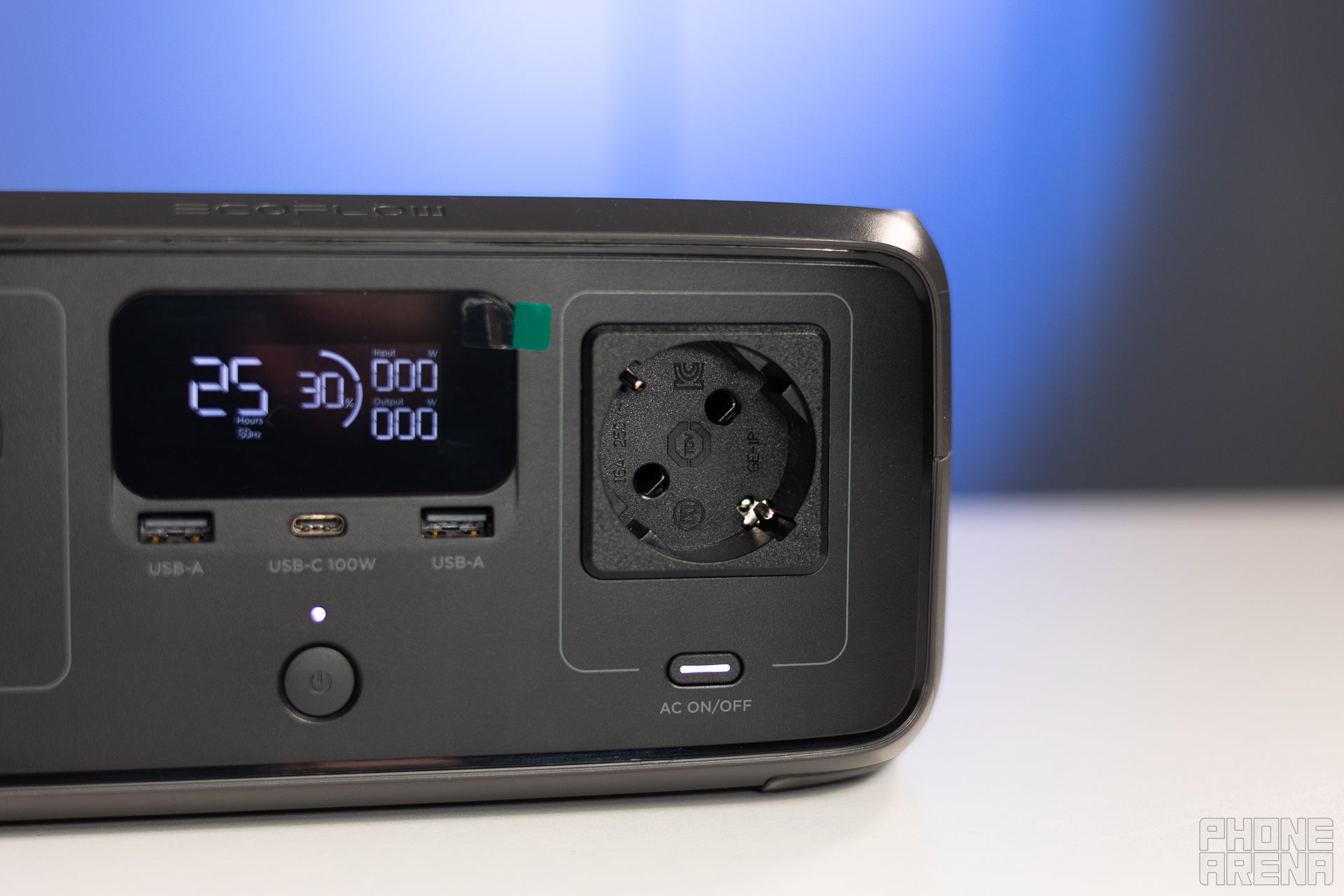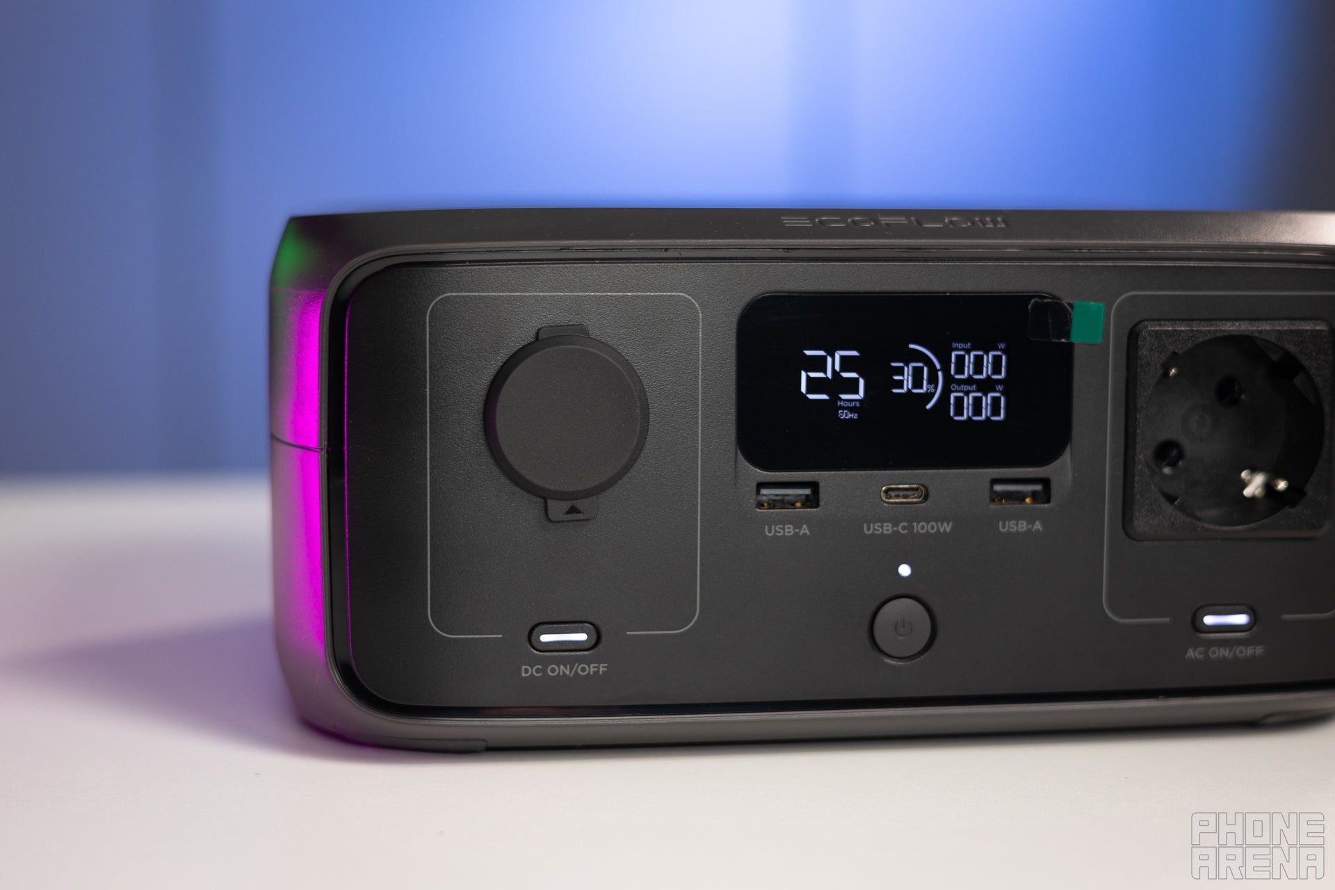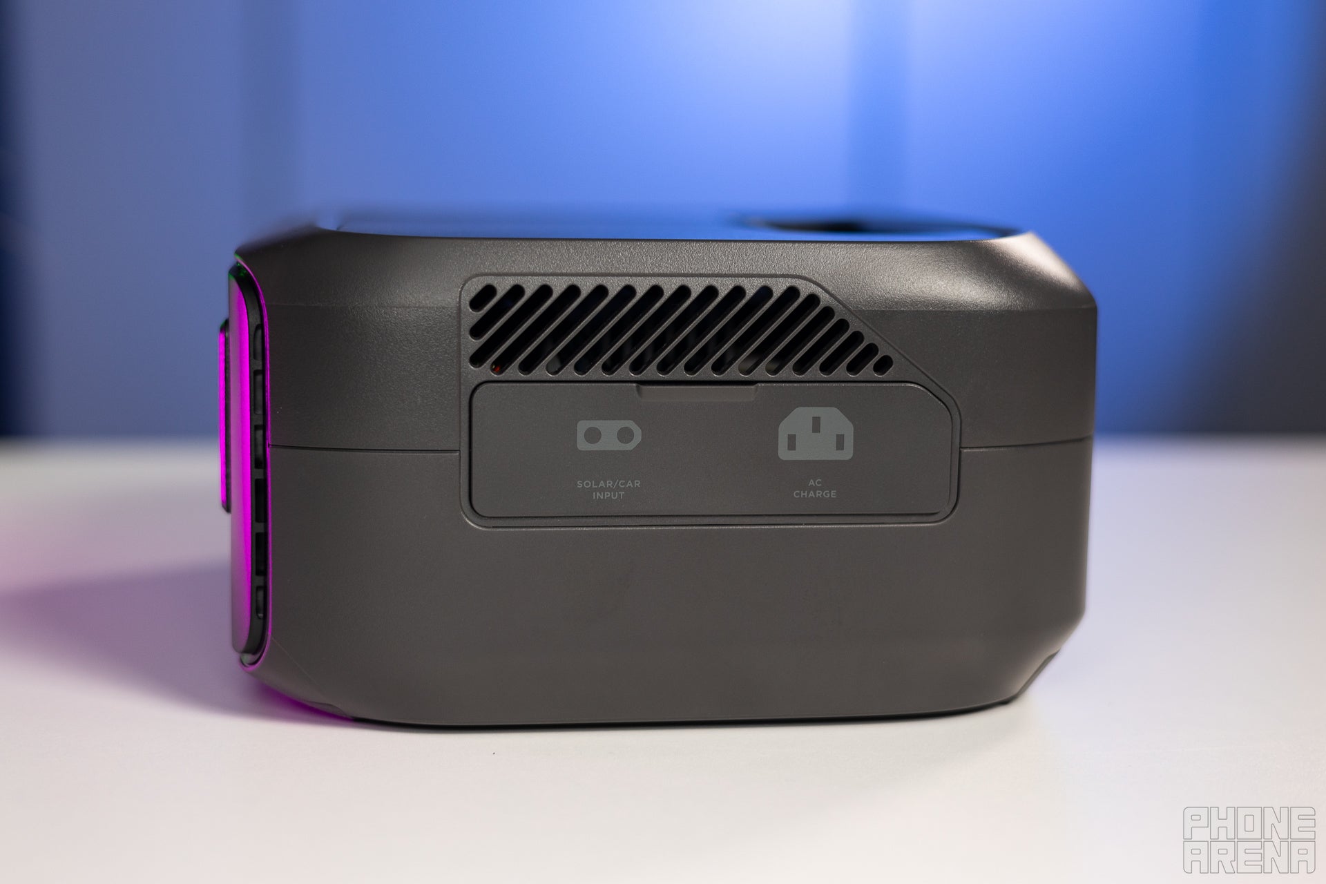 Как и в River 3 Plus, в этом устройстве есть вентиляционные решетки с обеих сторон для охлаждения, а также охлаждающий вентилятор меньшего размера с правой стороны, где расположены три порта для зарядки. Как и большинство станций, оно поддерживает зарядку от сети и от автомобиля. Устройство можно заряжать от солнечной энергии (до 110 Вт). Уникальная особенность заключается в том, что его также можно заряжать от газового генератора (через розетку переменного тока) примерно за час — такая функция редко встречается в портативных электростанциях.