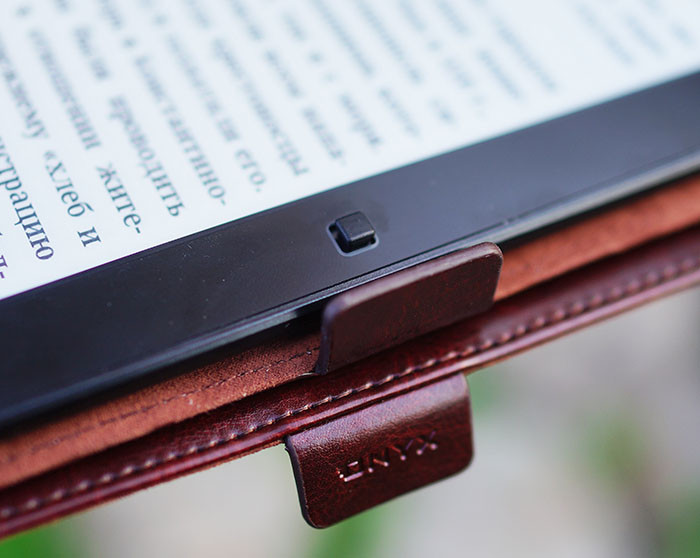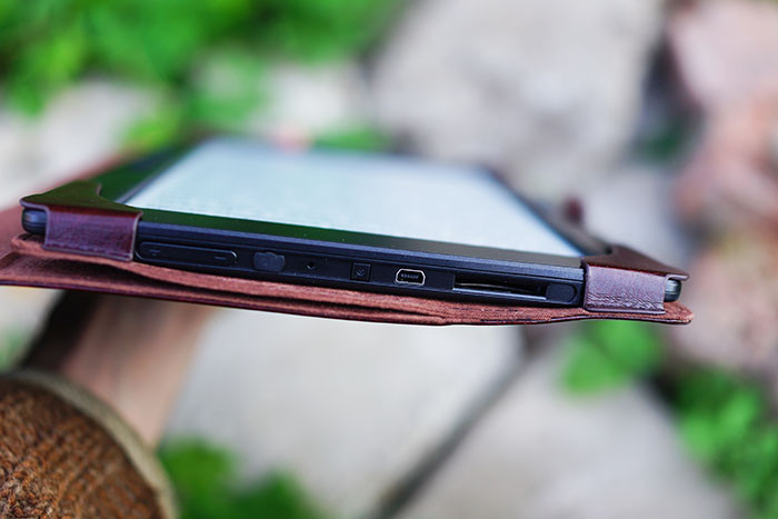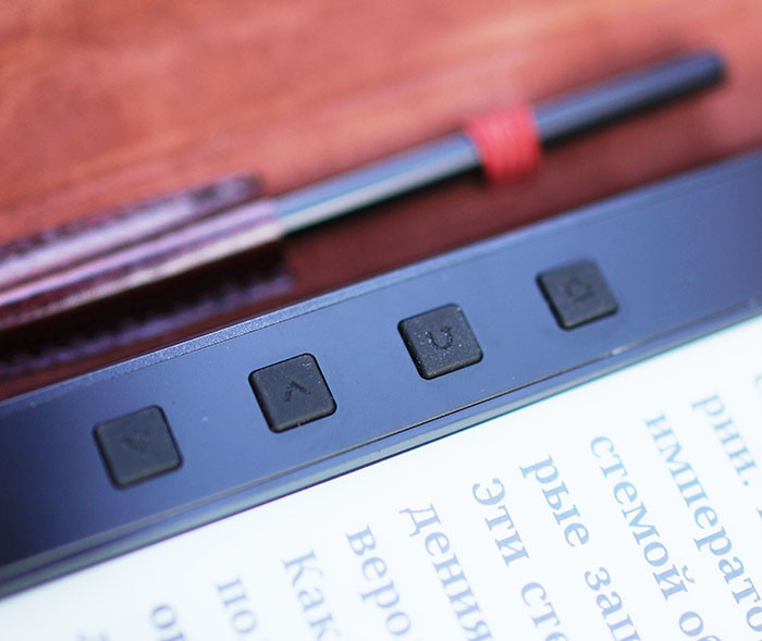 Впрочем, для тех, кому хочется «теплого аналогового» управления, традиционные кнопки также есть, причем в довольно большом количестве, что редкость для такого типа устройств. Так, к примеру, листать страницы можно не только кнопками на лицевой панели, но и двухпозиционной клавишей (для удобства в альбомном режиме), расположенной на нижнем торце устройства. В руки аппарат ложится уверенно. Но если лень держать его, то благодаря функциональной обложке устройство можно установить на стол в планшетном положении.