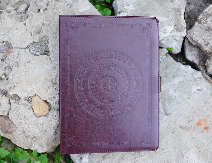 Первое что бросается в глаза, когда открываешь коробку с этим устройством – это великолепно выполненная обложка из экокожи, которая хорошо защищает аппарат от внешних воздействий, да и смотрится очень стильно благодаря витиеватому рисунку в древнегреческом стиле. Кстати для удобства она оснащена магнитной защелкой.