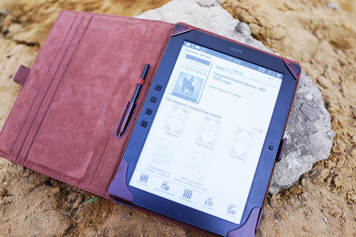 При немаленьких размерах аппарат имеет не слишком большую массу, и при длительном чтении дискомфорта не возникает. Экран, с диагональю 9,7 дюйма и разрешением 825х1200 точек, здесь выполнен по весьма удачной технологии E-Ink Pearl, которая позволяет выводить картинку с довольно высокой, по меркам электронных ридеров, контрастностью. Текст выводится четкий, без особых неровностей по краям, причем неплохо получается даже мелкий шрифт. Для удобства дисплей имеет матовое покрытие, предотвращающее появление нежелательных бликов. Ридер оснащен сенсорным управлением, выполненным по индукционной технологии. Для общения с ним в комплекте поставляется специальный стилус, который вставляется в отведенное для него место на обложке. А вот к нажатию пальцами он не чувствителен. На прикосновения стилуса устройство откликается вполне достойно, каких либо проблем в общении с ним мы не заметили. Срабатывание происходит быстро, с минимальной задержкой.