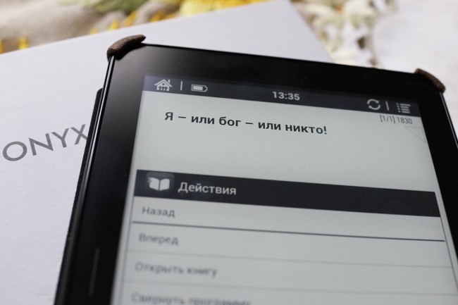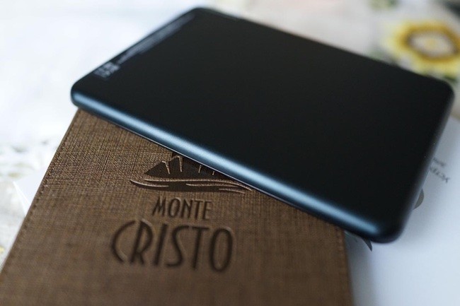 Честно говоря, я привык к большому 10-дюймовому ридеру, однако с ним не очень удобно ездить в метро из-за внушительных габаритов и массы. ONYX BOOX Monte Cristo 3 оказался намного меньше и легче и при этом очень удобно лег в руку. Диагональ его экрана составляет 6 дюймов, а разрешение одно из самых высоких в своем классе. Плотность размещения пикселей здесь достигает 300 ppi (рекордный показатель среди ридеров). Это замечаешь сразу же, откинув обложку. В режиме энергосбережения на экран выводится заставка с очень мелким шрифтом, но буквы выглядят так, как должны, и имеют четко очерченные границы. Дисплей у этой модели выполнен по одной из самых современных технологий E-Ink Carta Plus, который имеет по сравнению с предыдущим поколением заметно большую контрастность. Экран оснащен сенсорным покрытием, с которым приятно работать – срабатывает оно с первого раза, чутко реагируя на нажатия пальцев. Очень светлая подложка. При выводе текста ловишь себя на мысли, что чтение с этого ридера по ощущениям напоминает обычную бумажную книгу.