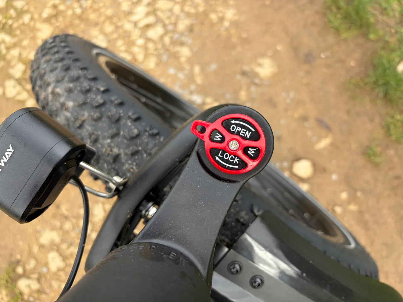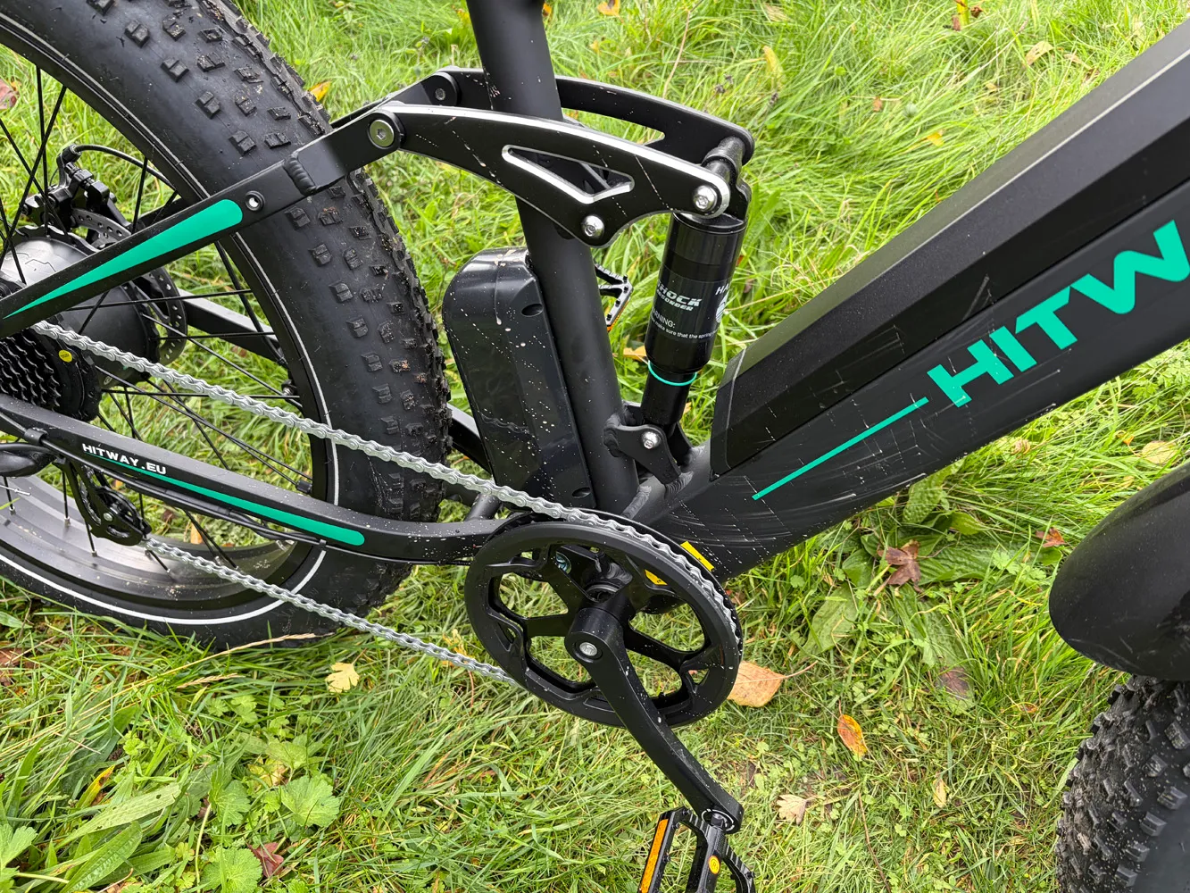 Пока что все кажется очень громоздким. Но у размера Hitway BK9S есть и плюсы: 26-дюймовые (66 см) широкие шины («фэт-тайры») в сочетании с подвеской на обоих колесах делают поездку очень комфортной. При желании можно заблокировать переднюю подвеску, хотя мы не знаем, зачем это может понадобиться — ведь главное в нем как раз комфорт.