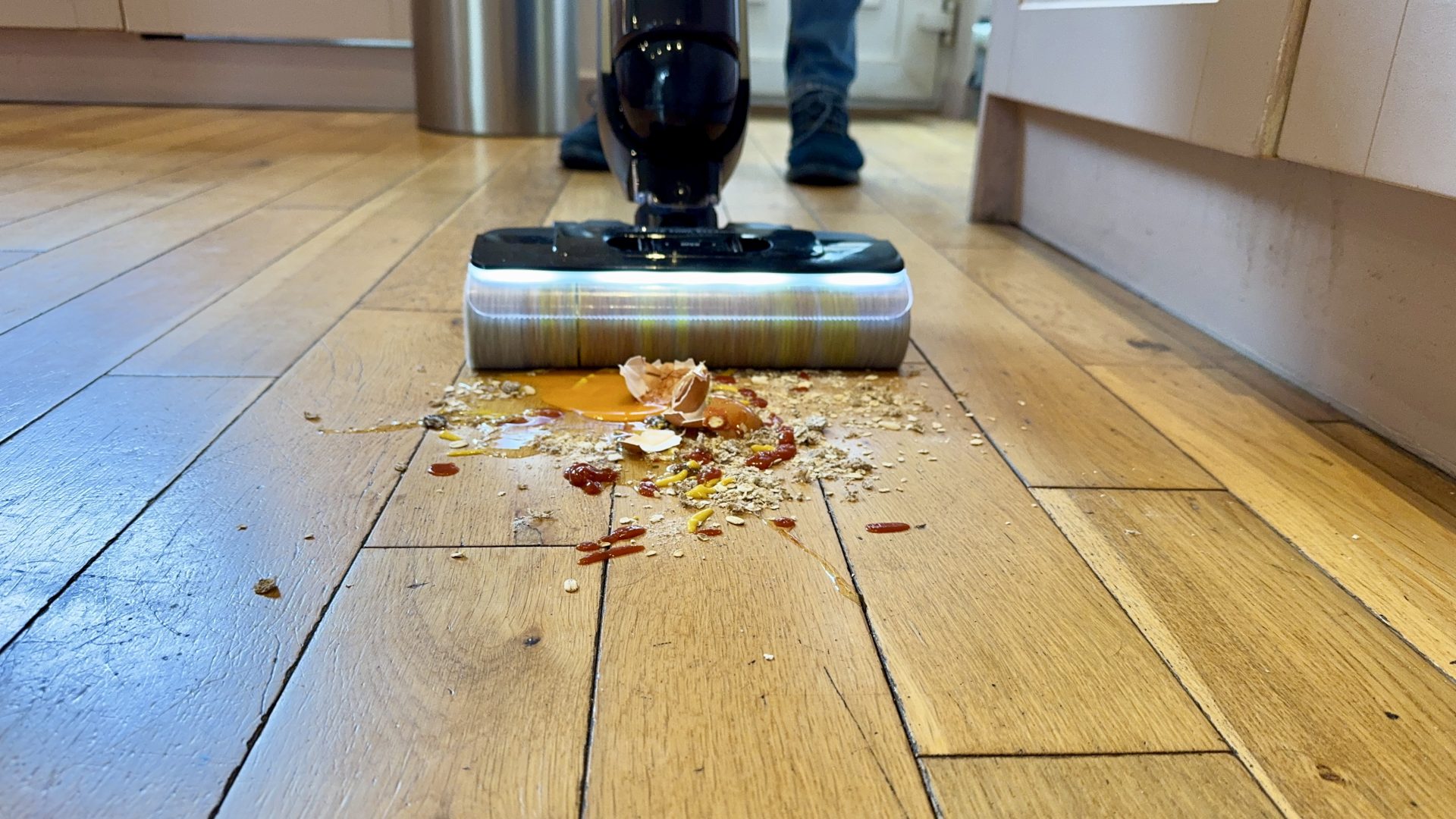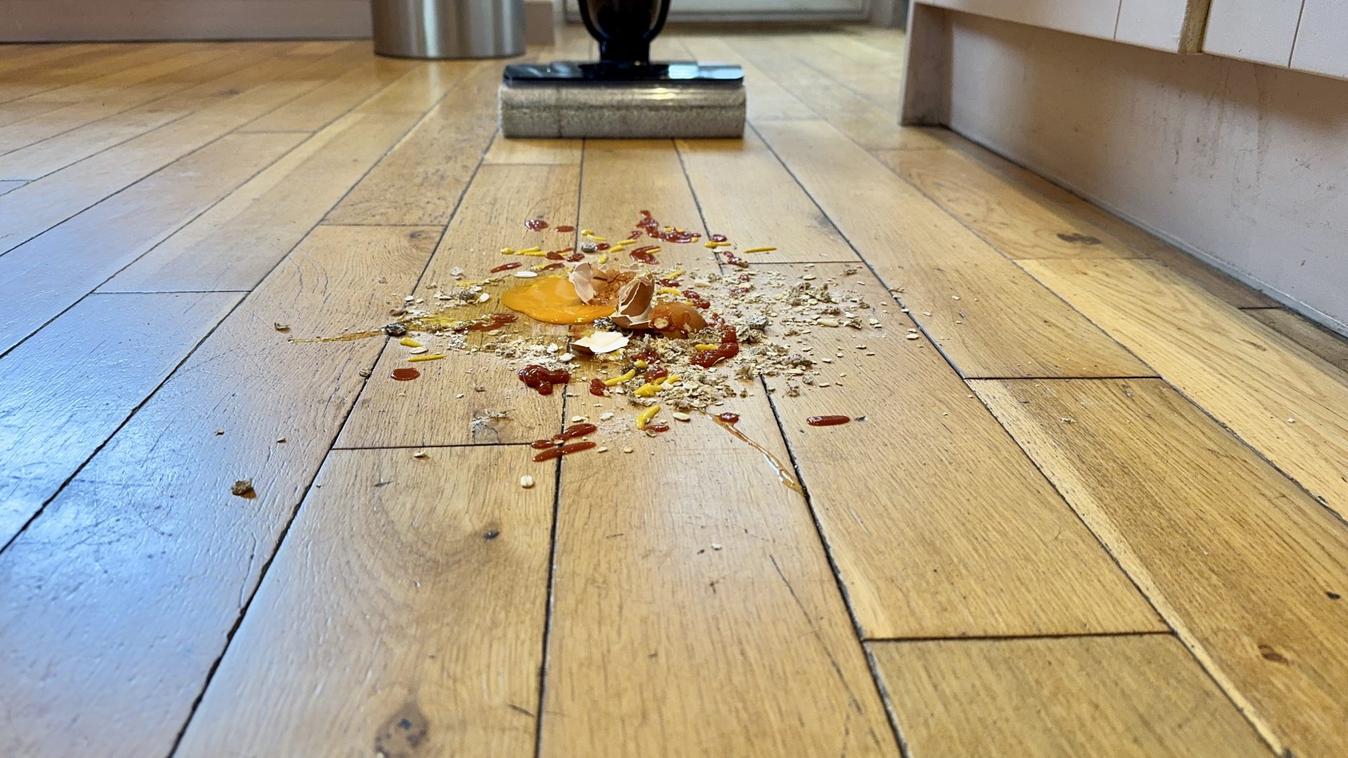 В более сложном тесте, где на пол были вылиты мюсли, кетчуп, горчица и разбито яйцо, пылесос справился с подавляющим большинством беспорядка за один проход, а с остатками — за второй.