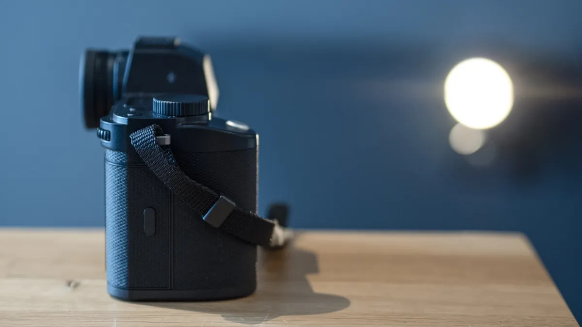 Фотокамера Leica SL3 на деревянной поверхности на синем фоне
