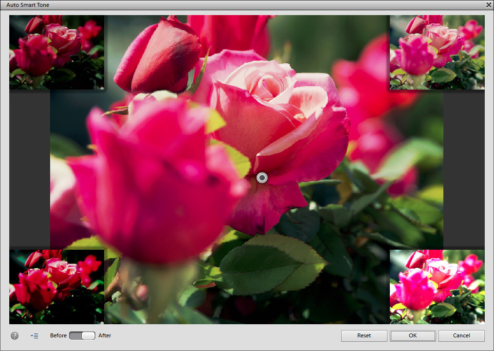 В меню Enhance появилась новая функция Auto Smart Tone, автоматически корректирующая уровень контрастности и освещенности. С помощью уникального интерфейса вы прямо на фотографии можете отрегулировать нужные параметры, перемещая джойстик в сторону одной из скорректированных миниатюр (они расположены в углах диалогового окна). Степень коррекции определяется уровнем смещения джойстика.