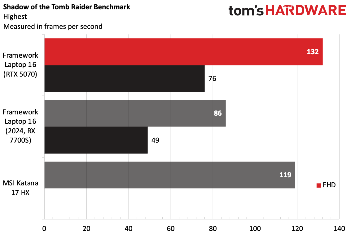 В тесте Shadow of the Tomb Raider (максимальные настройки) Framework с RTX 5070 запускал игру со скоростью 132 кадра в секунду при разрешении 1080p, опережая MSI с его 119 кадрами в секунду. При исходном разрешении 2560 x 1600 игра шла со скоростью 76 кадров в секунду.