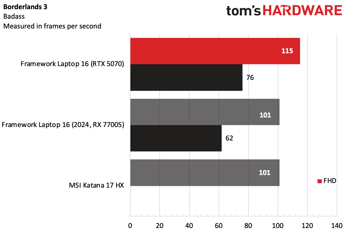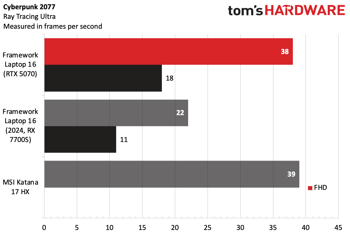 Мы сравнили эту систему с ноутбуком 2024 Framework Laptop 16 с Radeon RX 7700S, чтобы увидеть, насколько изменится производительность при обновлении процессора и графического процессора. Мы также сравнили игровой ноутбук MSI Katana 17 HX с RTX 5070.