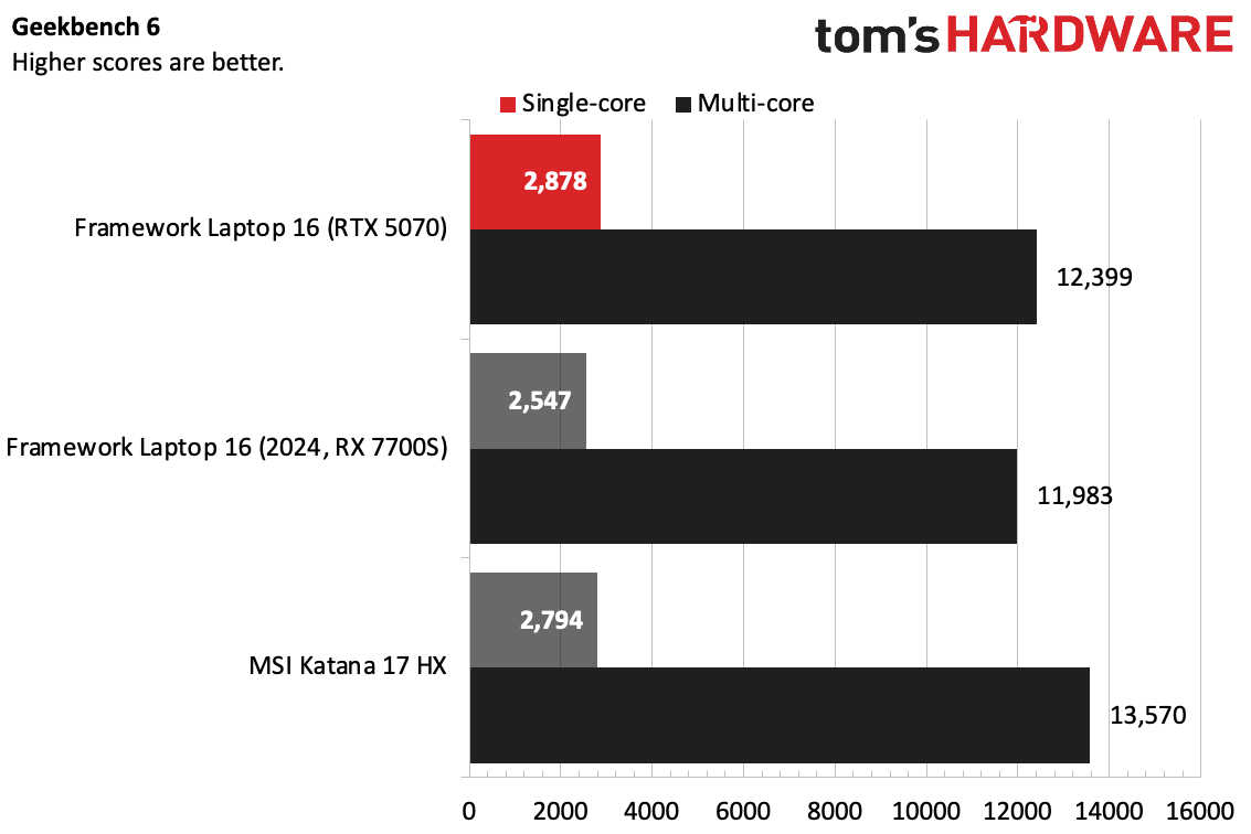 В Geekbench 6 ноутбук Framework 16 превзошёл как своего предшественника, так и Katana в одноядерной производительности, набрав 2878 баллов. В многоядерной производительности Framework показал улучшение по сравнению с предыдущим поколением, набрав 12 399 баллов, но Katana HX набрал больше. У этого процессора могут быть более старые ядра, но у него 16 ядер, в то время как у Ryzen AI 7 350 — 8 ядер.