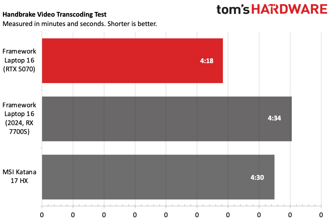 Новому ноутбуку Framework 16 потребовалось всего четыре минуты и 18 секунд, чтобы перекодировать видео 4K в формат 1080p. Это быстрее, чем у Katana (4:30) и Framework предыдущего поколения (4:34).