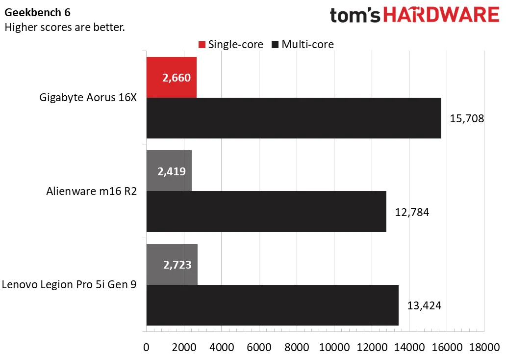 В Geekbench 6 Aorus 16X немного уступил Legion в одноядерном тесте, набрав 2660 баллов против 2723, но вырвался вперёд в многоядерном тесте, набрав 15 708 баллов против 13 424. Чип Core Ultra 7 от Alienware отставал, несмотря на более новую архитектуру, хотя, справедливости ради, его базовая мощность составляет 45 Вт, в то время как у чипов класса Core HX она равна 55 Вт.