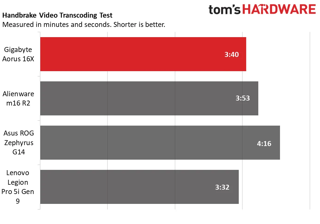 В тесте Handbrake Aorus 16X справился за 3 минуты 40 секунд, уступив Legion с его результатом 3:32. Alienware справился за 3:53, а у Asus было самое медленное время — 4:16.