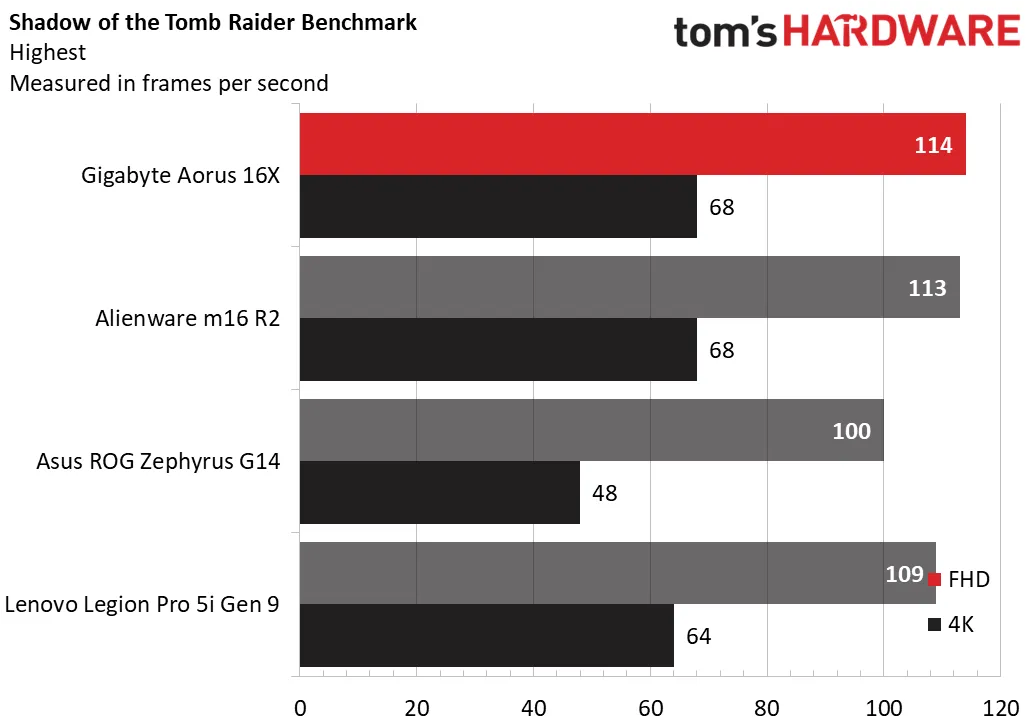 В Shadow of the Tomb Raider (с максимальными настройками детализации) Aorus 16X показал 114 кадров в секунду при разрешении 1080p и 68 кадров в секунду при разрешении 1600p, почти сравнявшись с показателями Alienware — 113 кадров в секунду и 68 кадров в секунду. Legion, оснащённый RTX 4060, был почти на уровне — 109 кадров в секунду и 64 кадра в секунду. Между тем Asus достиг частоты 100 кадров в секунду при разрешении 1080p, но при исходном разрешении частота упала до 48 кадров в секунду.
