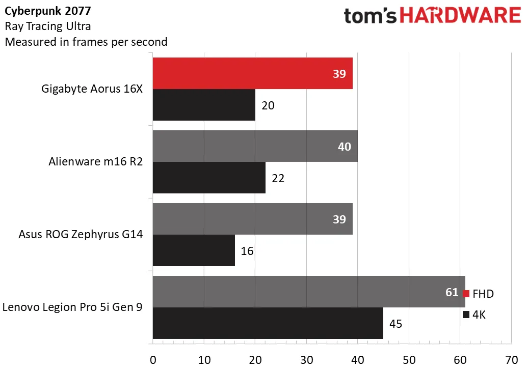 Cyberpunk 2077 (с трассировкой лучей в режиме Ultra) оказалась сложной задачей для всех этих устройств. Aorus 16X и Alienware шли ноздря в ноздрю, при этом Alienware немного опережал Aorus в разрешении 1600p, выдавая 22 кадра в секунду против 20 у Aorus. Legion показал значительно лучшие результаты по непонятным для нас причинам, а Asus предсказуемо занял последнее место.