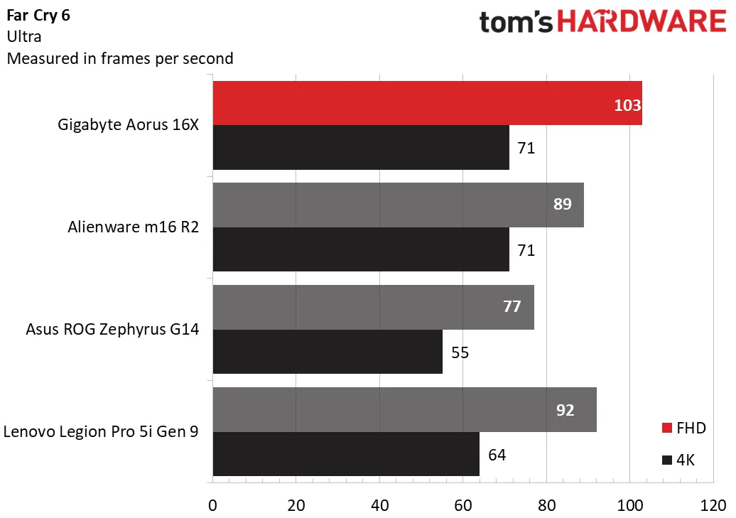 103 кадра в секунду при разрешении 1080p в Far Cry 6 (на максимальных настройках) у Aorus 16X были намного лучше, чем 89 кадров в секунду у Alienware и 92 кадра в секунду у Legion. При разрешении 1600p показатели были такими же, как у Alienware, — 71 кадр в секунду.