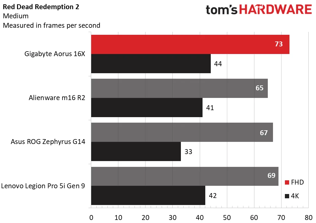 Red Dead Redemption 2 (средние настройки) — ещё один хороший результат для Aorus 16X: 73 кадра в секунду при разрешении 1080p лучше, чем 65 кадров в секунду у Alienware и 69 кадров в секунду у Legion. 44 кадра в секунду при разрешении 1600p — тоже лучший результат, у Alienware и Legion показатели 41 и 42 кадра в секунду соответственно.