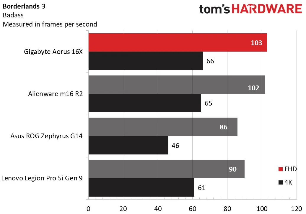 Borderlands 3 (с настройками игры «Badass») стала ещё одним фотофинишем для Aorus 16X и Alienware в разрешении 1080p при обоих разрешениях. Legion здесь уступил: всего 61 кадр в секунду при разрешении 1600p по сравнению с 66 кадрами в секунду у Aorus.