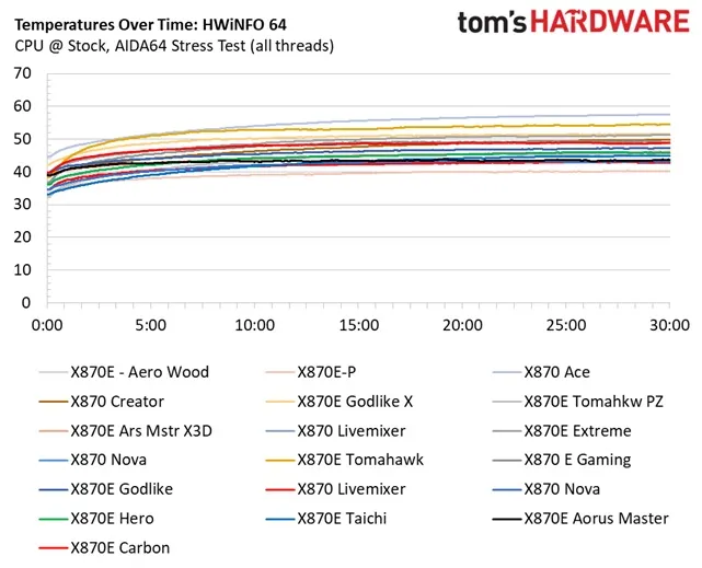 Для теста энергопотребления мы использовали стресс-тест стабильности системы в AIDA64 (с нагрузкой на CPU, FPU, кэш и память), замеряя пиковое значение потребления процессора. Показания снимались с розетки с помощью ваттметра Kill-A-Watt, который измерял потребление всего системного блока (кроме монитора). Единственной переменной была материнская плата; все остальные компоненты оставались неизменными. Мы перешли на использование только стандартных графиков энергопотребления/температуры VRM, так как главная задача этого раздела — убедиться, что система питания способна справиться с флагманскими процессорами.