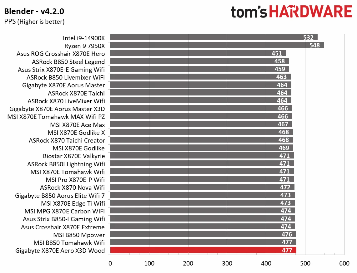 Производительность этой материнской платы оказалась одной из лучших, которые я видела в целом. Используя последнюю версию BIOS (с AGESA 1.2.8.0), я получила одни из лучших результатов среди более чем 25 материнских плат B850/X870, которые я рассматривала до сих пор. В тестах 7-Zip, LAME, Corona, Cinebench, POV-Ray, Handbrake и Blender плата показала самые высокие или быстрые результаты. В играх показатели также были выше среднего (хотя 3DMark показал низкие результаты), что делает эту плату одной из лучших по производительности среди всех, что я тестировала.