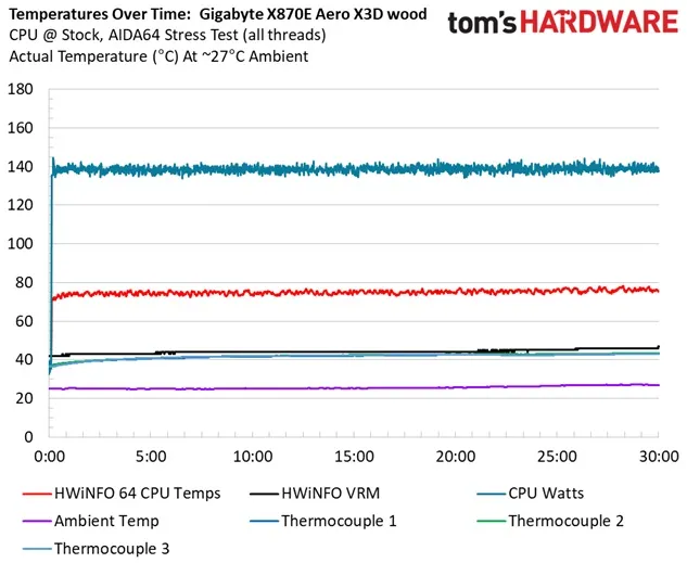 Температура VRM достигла пика в 47 градусов Цельсия по данным внутреннего датчика и 43 градусов по данным нашего самого горячего датчика. Этот результат, даже при температуре окружающей среды 27 градусов (выше наших типичных 24/25°C), был хорошим по сравнению с другими протестированными нами платами X870. Вы можете без проблем использовать с ними процессор флагманского класса и разгонять его.