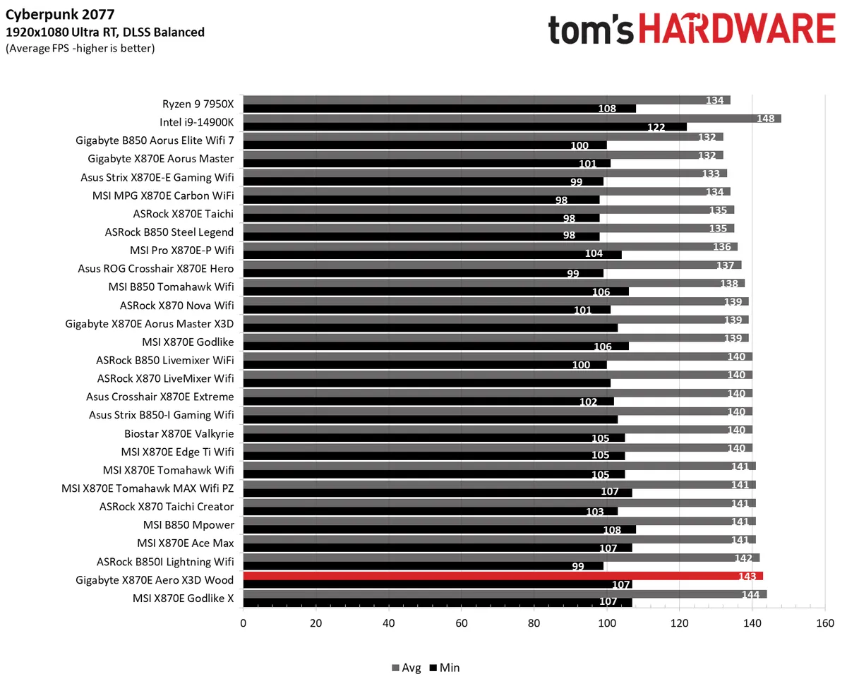 Цель этих настроек — выяснить, есть ли разница в производительности в самом популярном (и зависимом от процессора/системы) разрешении с теми настройками, которые использует или к которым стремится большинство геймеров. Мы ожидаем, что разница между материнскими платами в этих тестах будет минимальной, в пределах погрешности. Мы также добавили замер минимального FPS, который напрямую влияет на плавность игрового процесса.