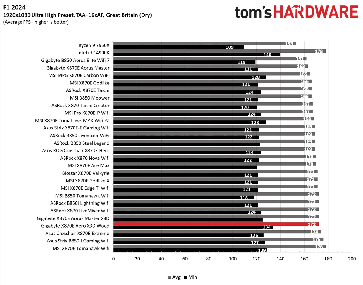Тесты 3DMark показали результаты ниже среднего, но разница между худшим и первым местом составляет всего 1% при использовании одного и того же процессора. Тестирование самих игр показало другую картину, и мы вернулись к привычной высокой производительности. Фактически, в Cyberpunk 2077 игра показала второй лучший результат — 143 кадра в секунду, а F1 24 также показала высокий средний результат в 172 кадра в секунду (и самый быстрый минимальный показатель).