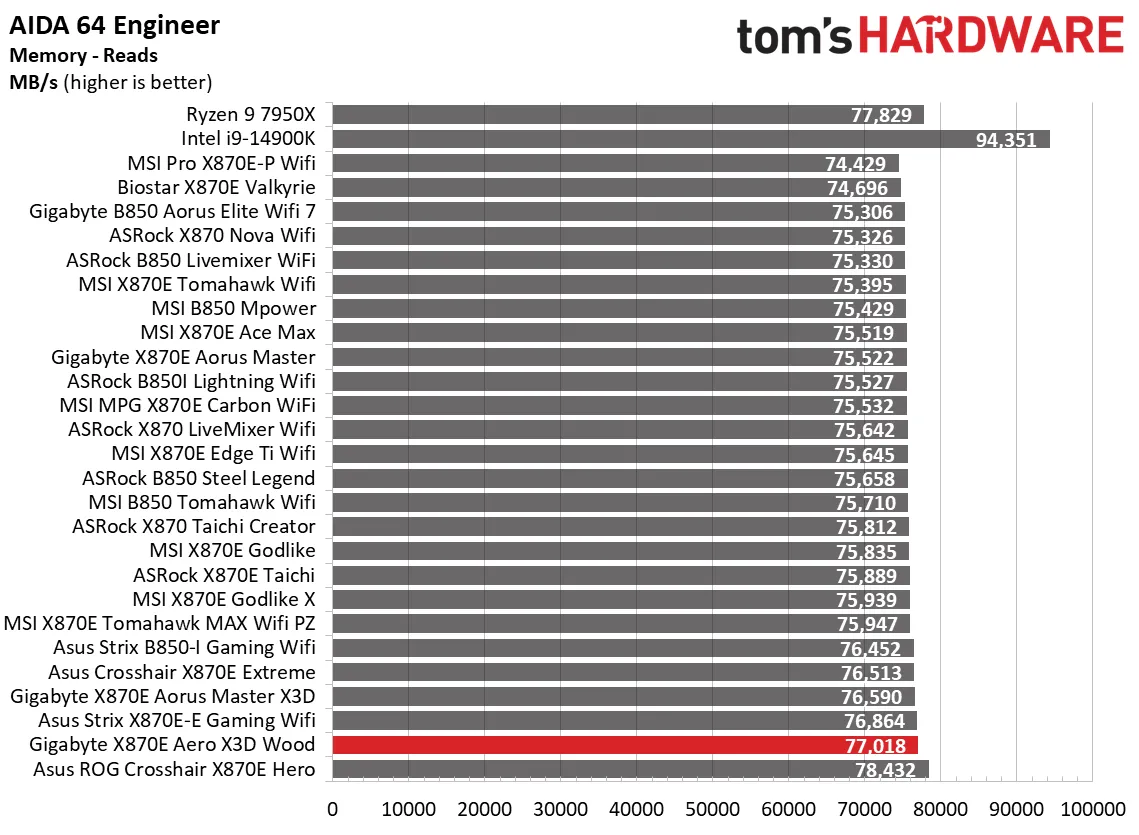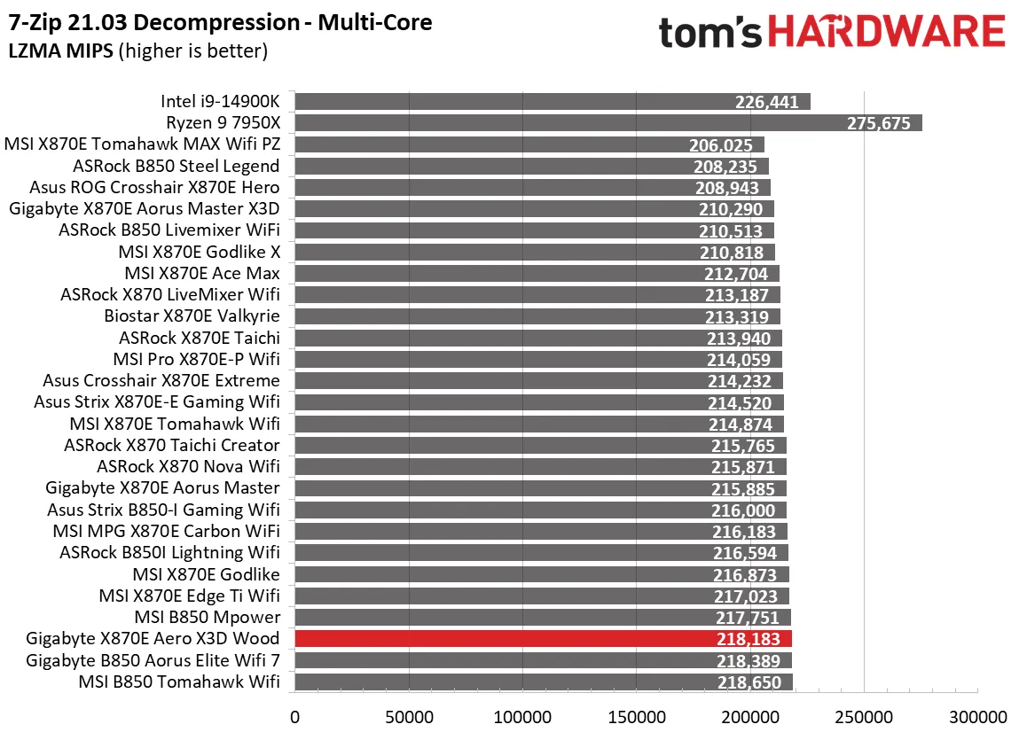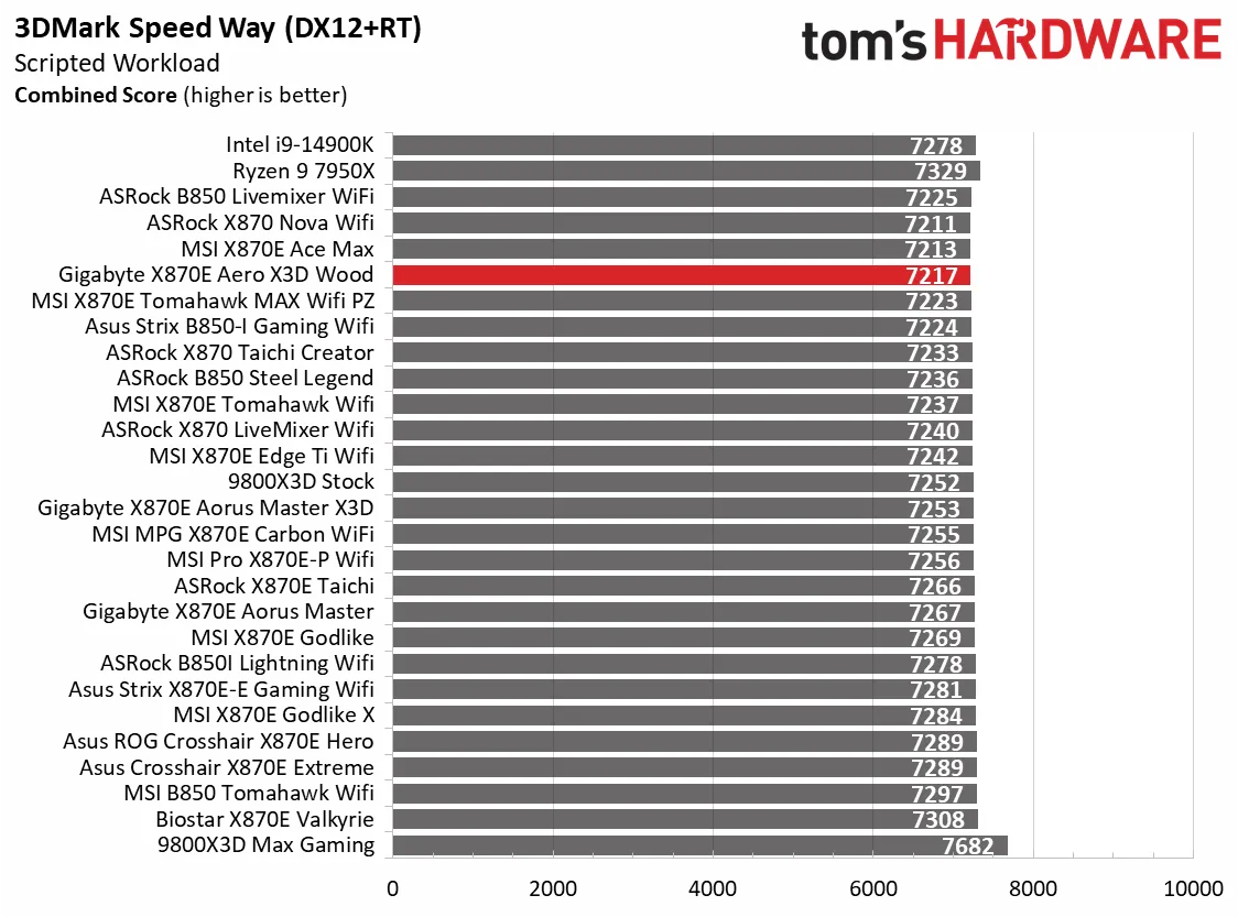 Материнская плата X870E Aero X3D Wood ($499,99, около 40 тыс. руб.) — это не просто красивый дизайн. Она может похвастаться превосходным набором функций, включая четыре разъема M.2, два порта 5 Гбит/с Ethernet (уникальная особенность среди прямых конкурентов), быстрый Wi-Fi 7 и два порта USB 4. По своим характеристикам она не уступает конкурентам в аналогичной ценовой категории, таким как Asus ProArt X870E-Creator ($504,99), MSI X870E Carbon ($429,99) и ASRock X870E Taichi OCF ($499,99). Помимо внешнего вида и оснащения, плата также показала очень хорошие результаты в наших всесторонних тестах.