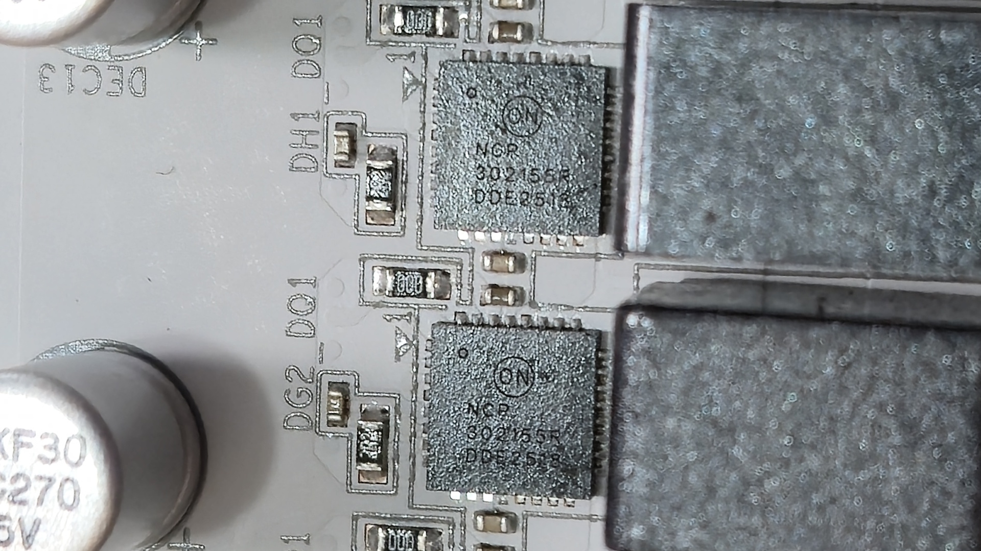 На материнской плате X870E Aero X3D Wood VRM-модули состоят из 20 фаз, 16 из которых выделены для Vcore (в параллельной схеме питания). Питание поступает от 8-контактного разъема EPS в верхнем левом углу к контроллеру Richtek RT3678BE. Оттуда оно передается на MOSFET-транзисторы On Semiconductor 55A NCP302155R Dr. MOS. Любопытно, что Gigabyte указывает на своем веб-сайте ток 60 А, тогда как в техническом описании указано 55 А (средний ток, пиковый – 80 А). Я обратилась к Gigabyte за разъяснениями и внесу необходимые изменения.