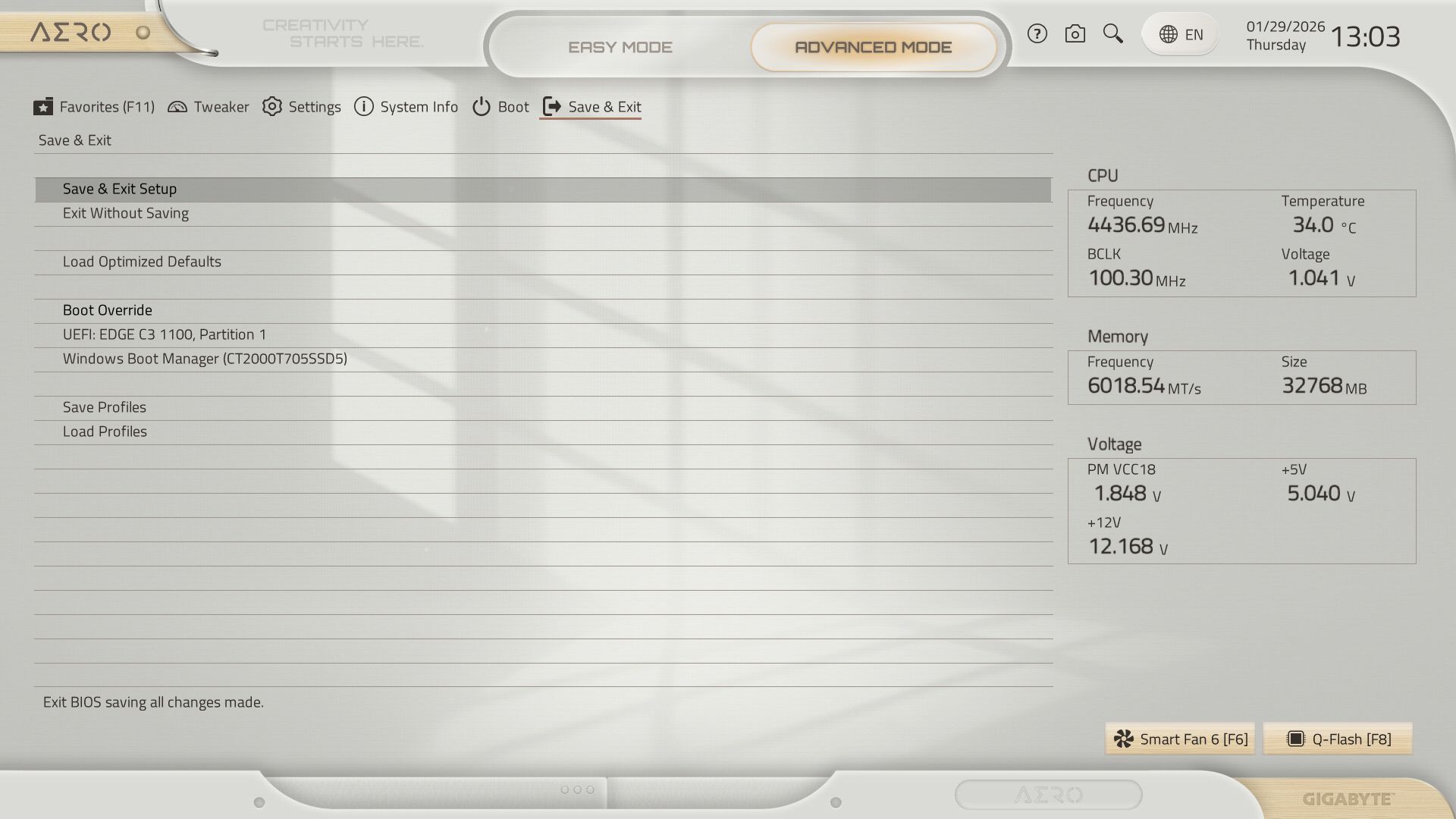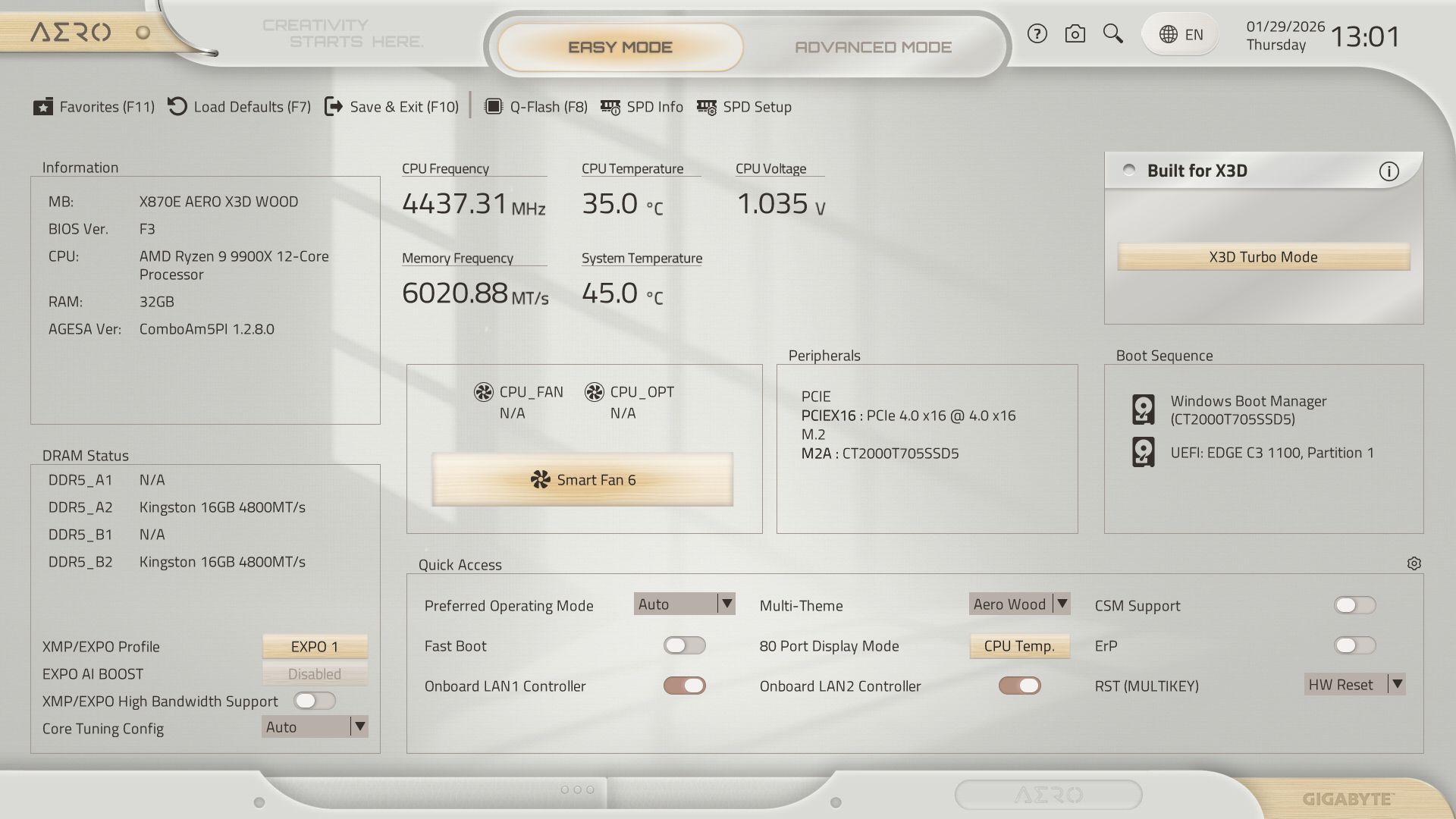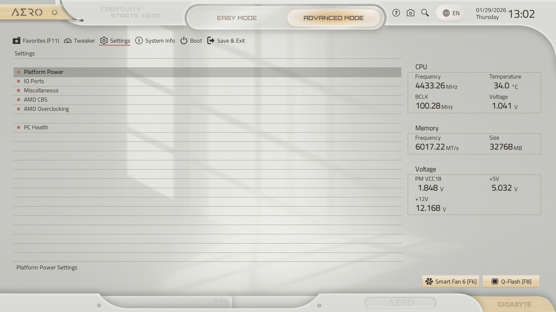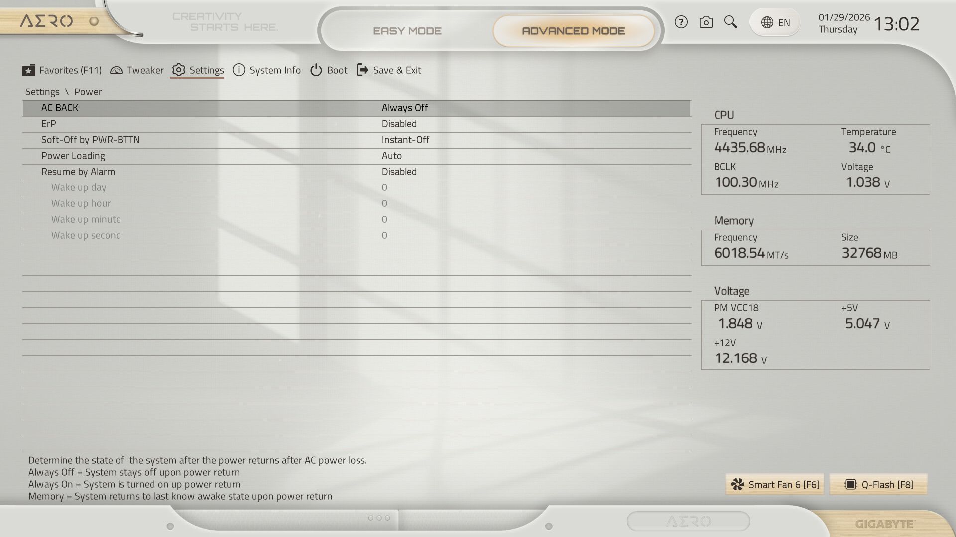 Обновленный BIOS от Gigabyte, получивший название «UC BIOS 2.0», встречает нас упрощенным режимом (EZ Mode). У него логичная структура, и на главном экране сразу видно кучу полезной информации: данные о процессоре, оперативке, скорости вертушек и несколько быстрых переключателей вроде профилей XMP, настройки памяти, поддержки Re-Size BAR, доступа к Smart Fan 6 и прочего. В версии для Aero Wood интерфейс BIOS оформлен в стильной серебристой цветовой гамме с кнопками, стилизованными под дерево.