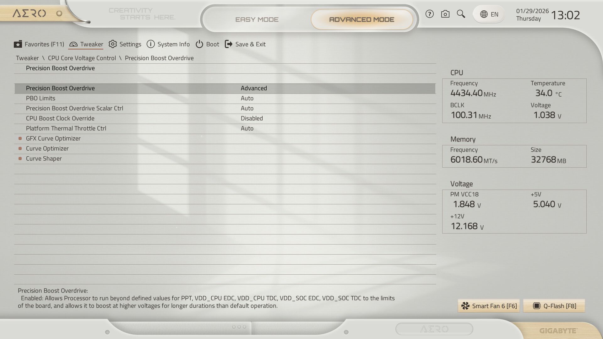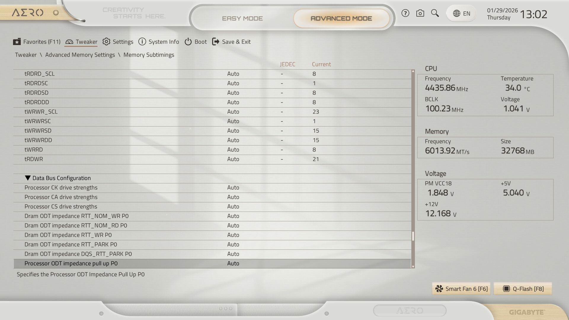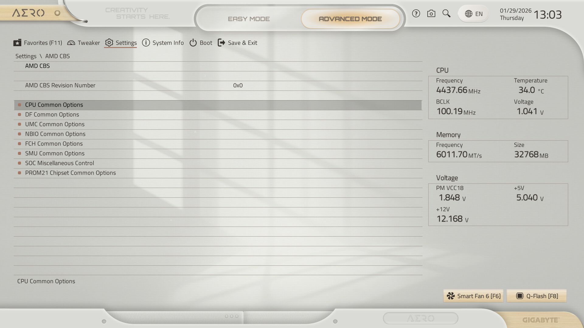 Обновленный BIOS от Gigabyte, получивший название «UC BIOS 2.0», встречает нас упрощенным режимом (EZ Mode). У него логичная структура, и на главном экране сразу видно кучу полезной информации: данные о процессоре, оперативке, скорости вертушек и несколько быстрых переключателей вроде профилей XMP, настройки памяти, поддержки Re-Size BAR, доступа к Smart Fan 6 и прочего. В версии для Aero Wood интерфейс BIOS оформлен в стильной серебристой цветовой гамме с кнопками, стилизованными под дерево.