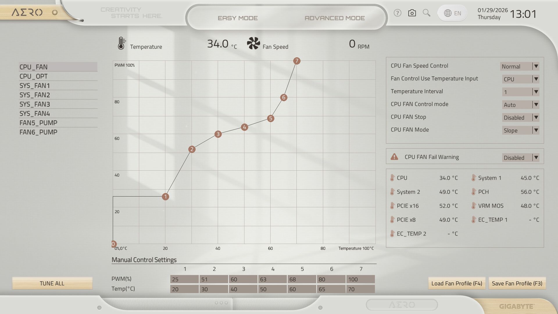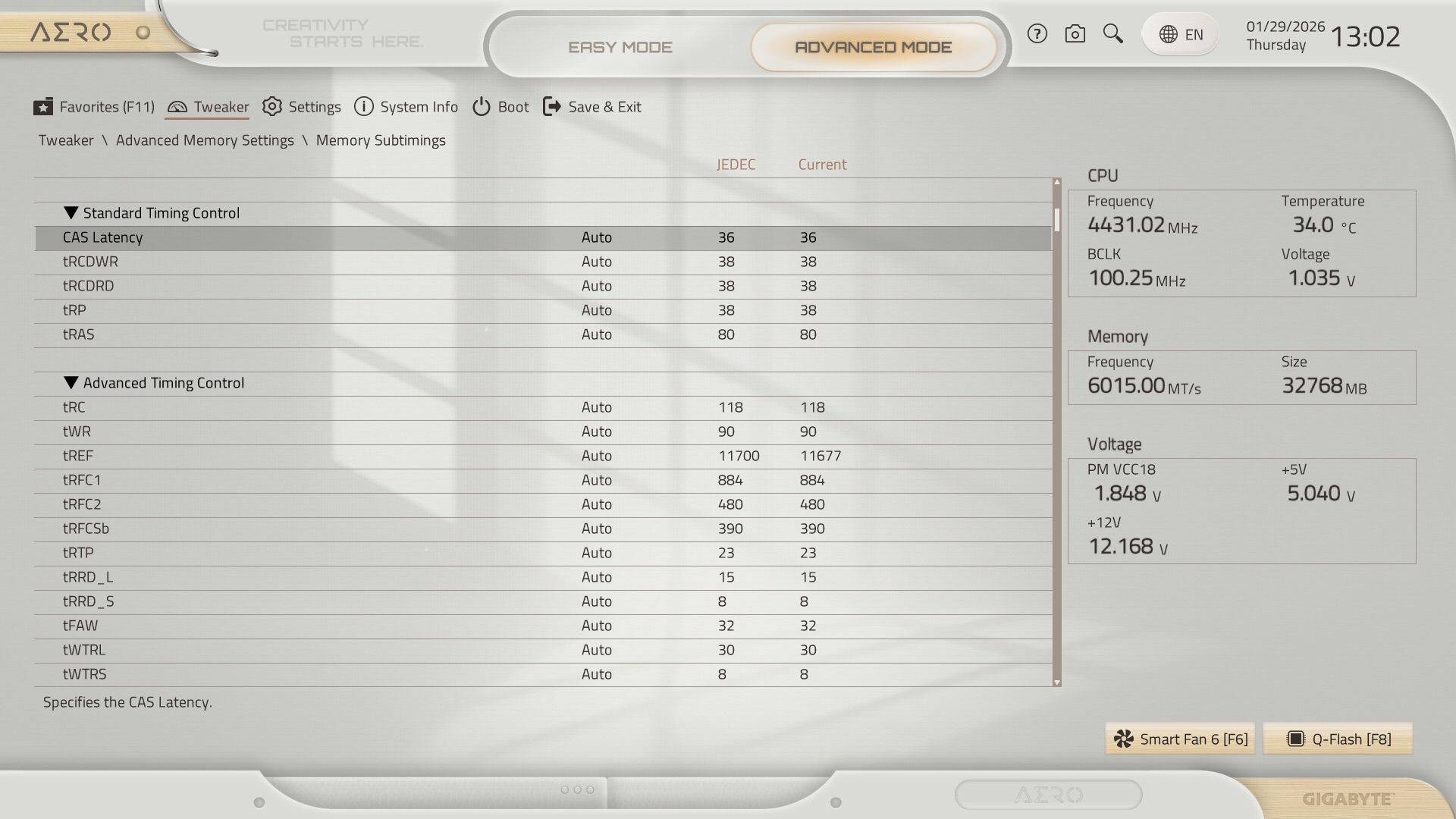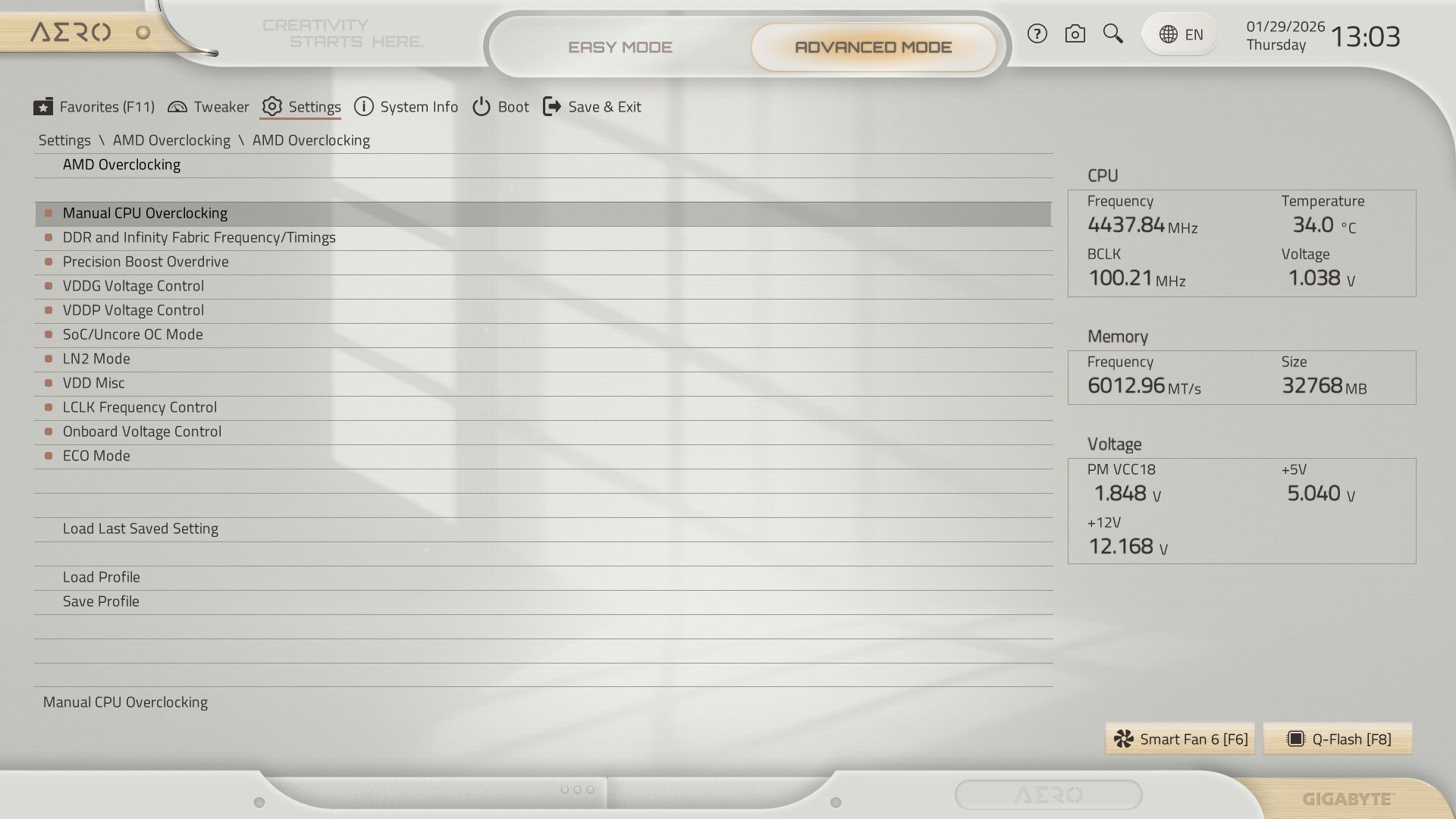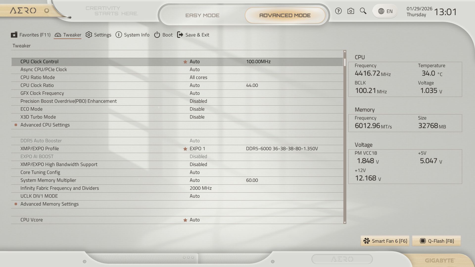 Обновленный BIOS от Gigabyte, получивший название «UC BIOS 2.0», встречает нас упрощенным режимом (EZ Mode). У него логичная структура, и на главном экране сразу видно кучу полезной информации: данные о процессоре, оперативке, скорости вертушек и несколько быстрых переключателей вроде профилей XMP, настройки памяти, поддержки Re-Size BAR, доступа к Smart Fan 6 и прочего. В версии для Aero Wood интерфейс BIOS оформлен в стильной серебристой цветовой гамме с кнопками, стилизованными под дерево.
