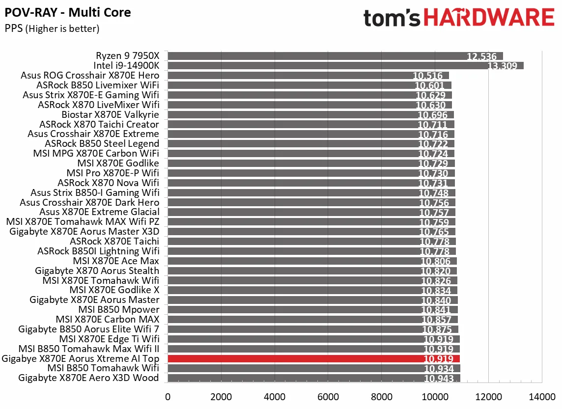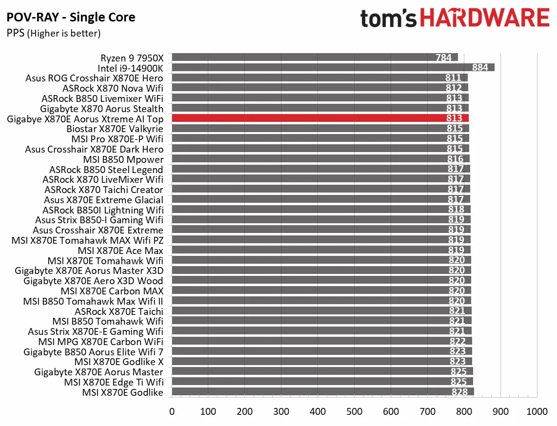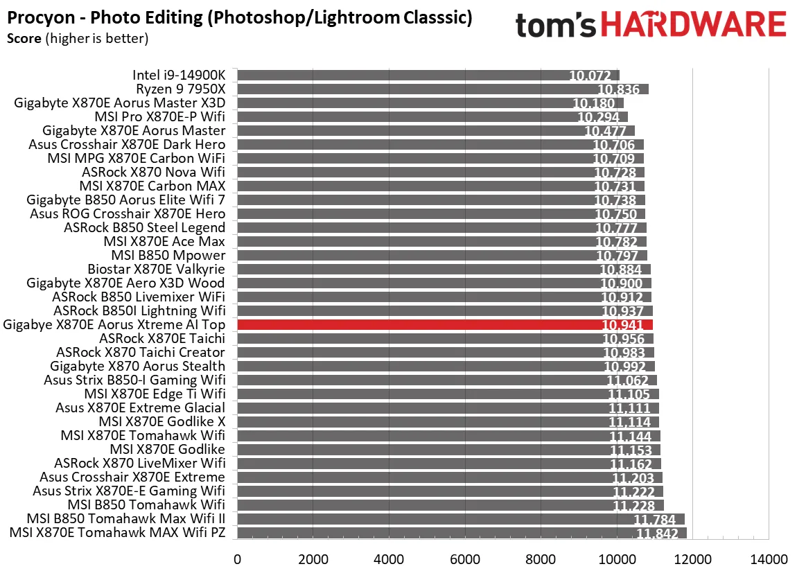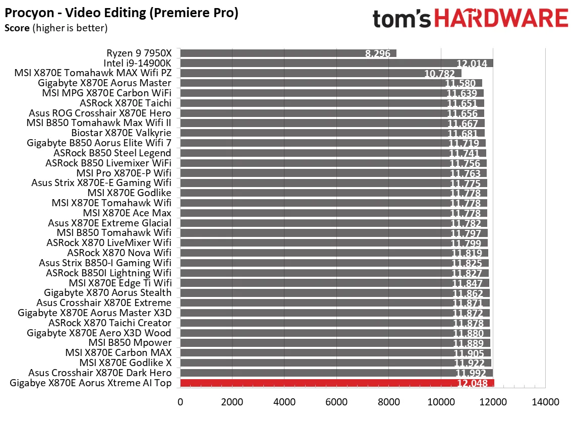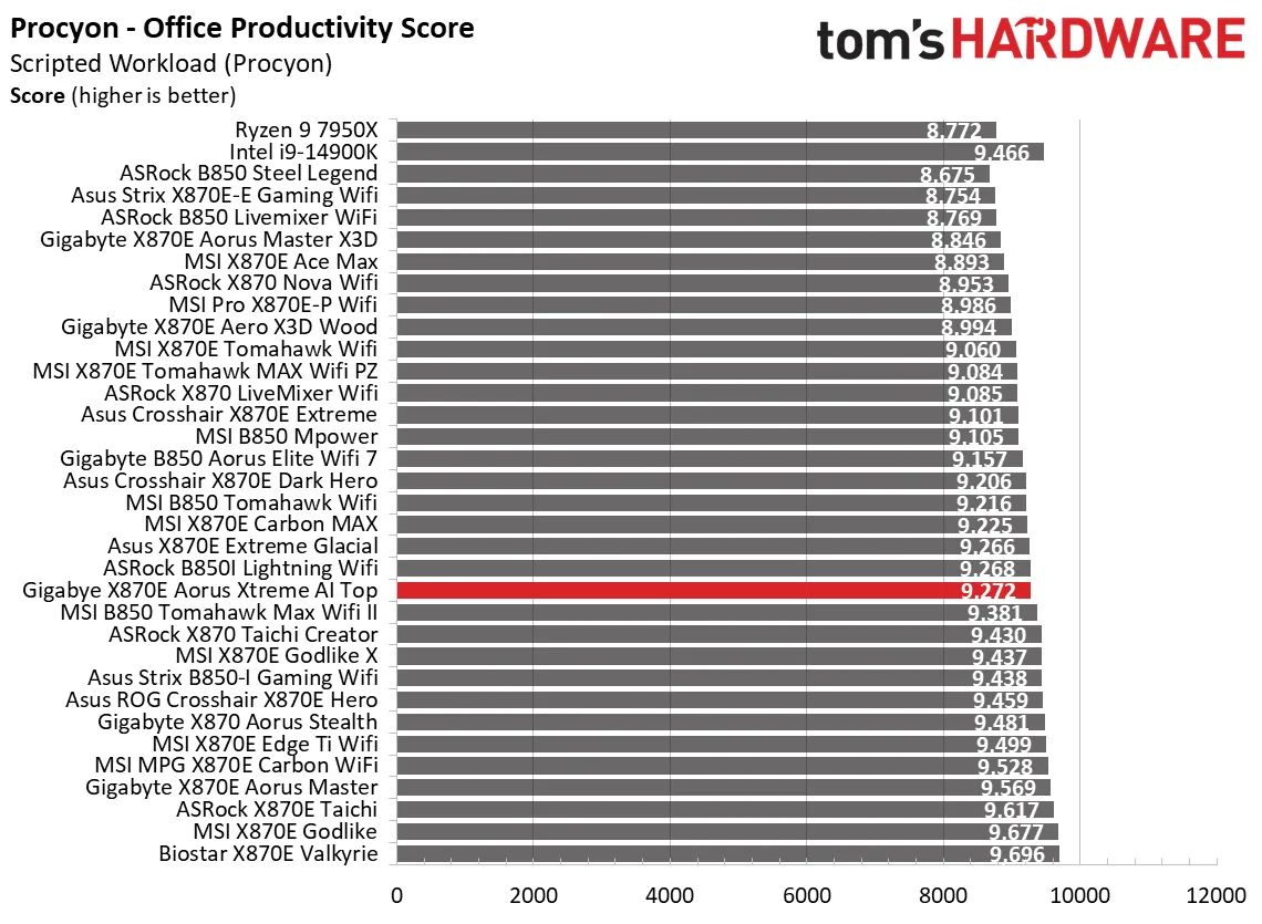 Синтетические тесты отлично показывают, как плата работает с базовыми настройками. И Aorus Xtreme AI Top здесь просто блистает. Плата выдала одни из самых высоких баллов в офисных приложениях, рендеринге и кодировании видео.