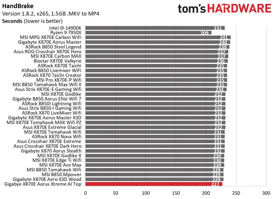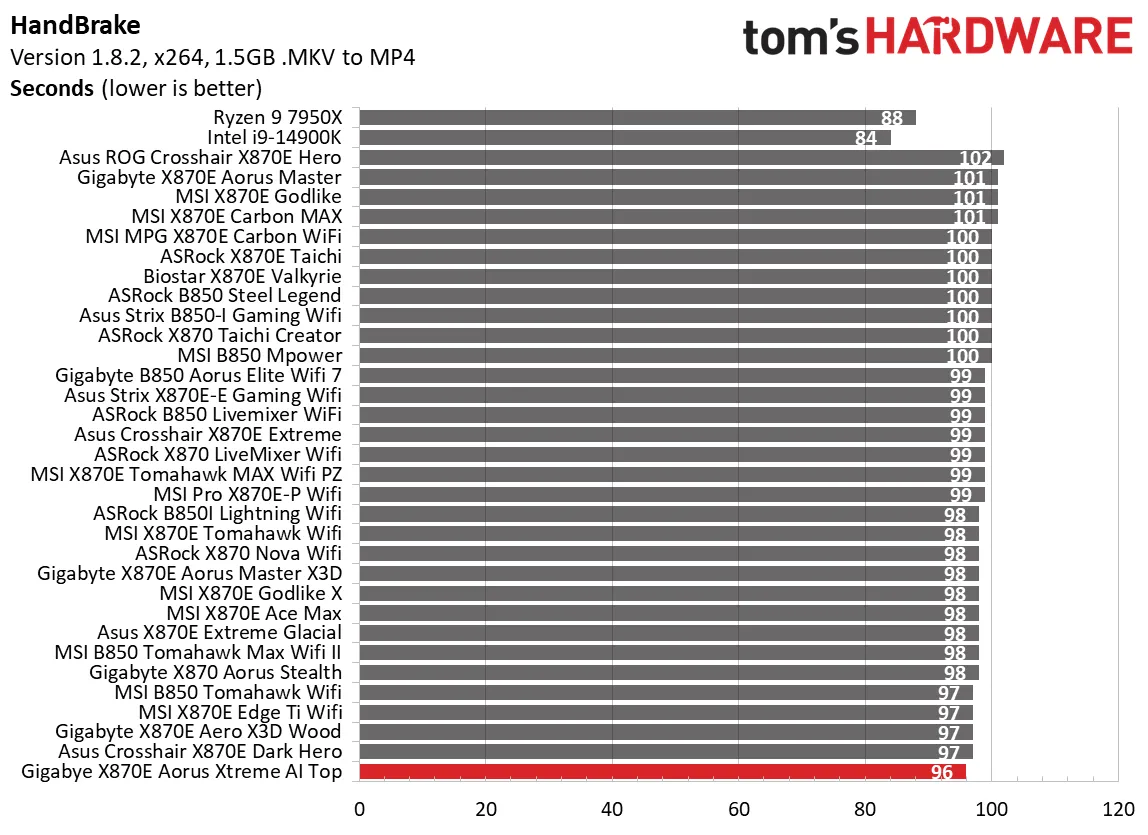 Особенно порадовал тест Handbrake: плата идеально распорядилась ресурсами процессора и памяти, обогнав более тридцати протестированных ранее моделей. В Corona и LAME результаты также держались в топе таблиц.