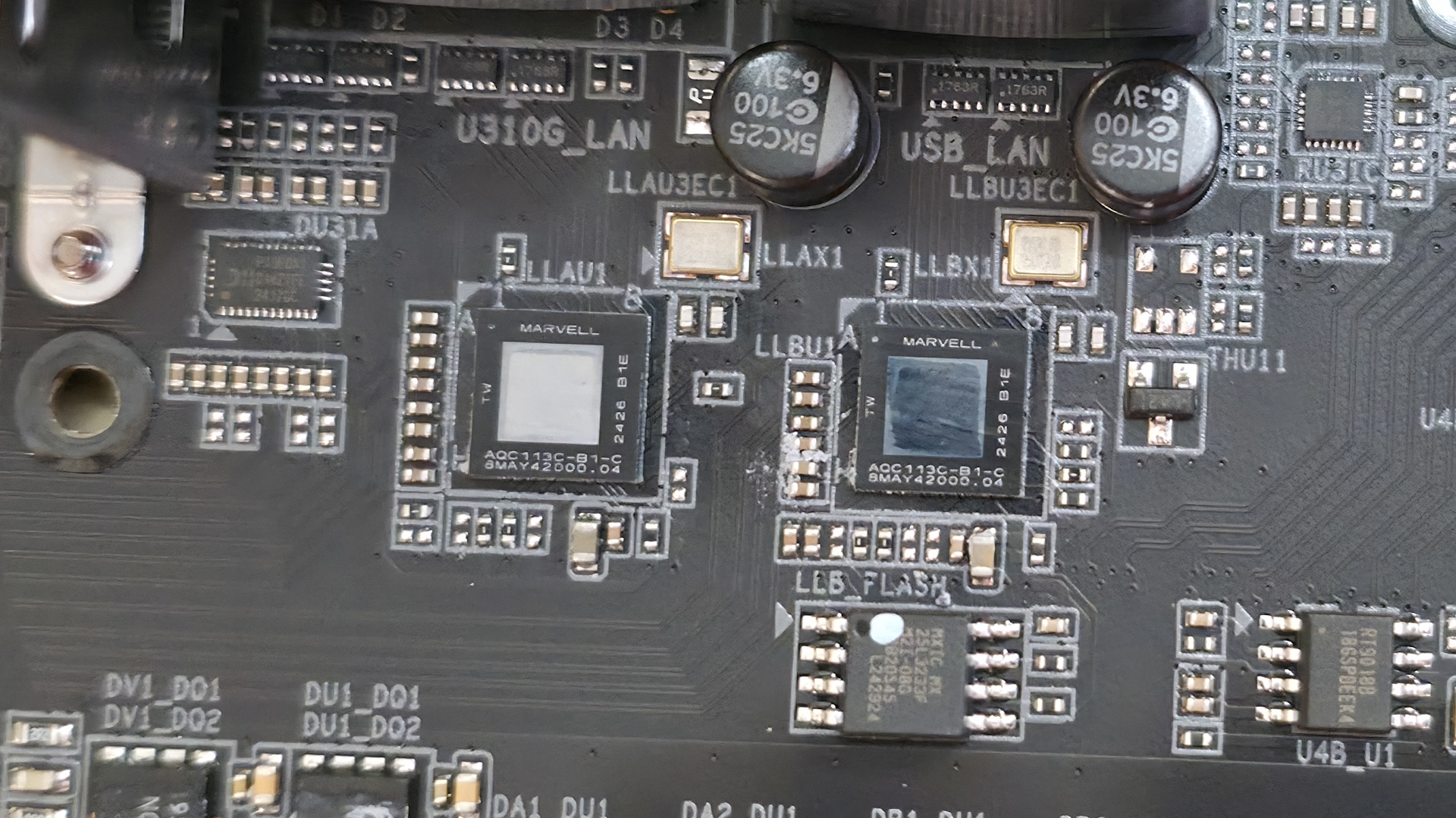 Мы также сделали несколько снимков микросхем, используемых Gigabyte на этой плате. Мы видим ASMedia для USB, Infineon для ШИМ-контроллера и MOSFET-транзисторов, а также Realtek, отвечающий за звук, ШИМ-управление и USB. За сетевые функции отвечают Marvell и Qualcomm (для версии 1.0, Mediatek для версии 1.1).