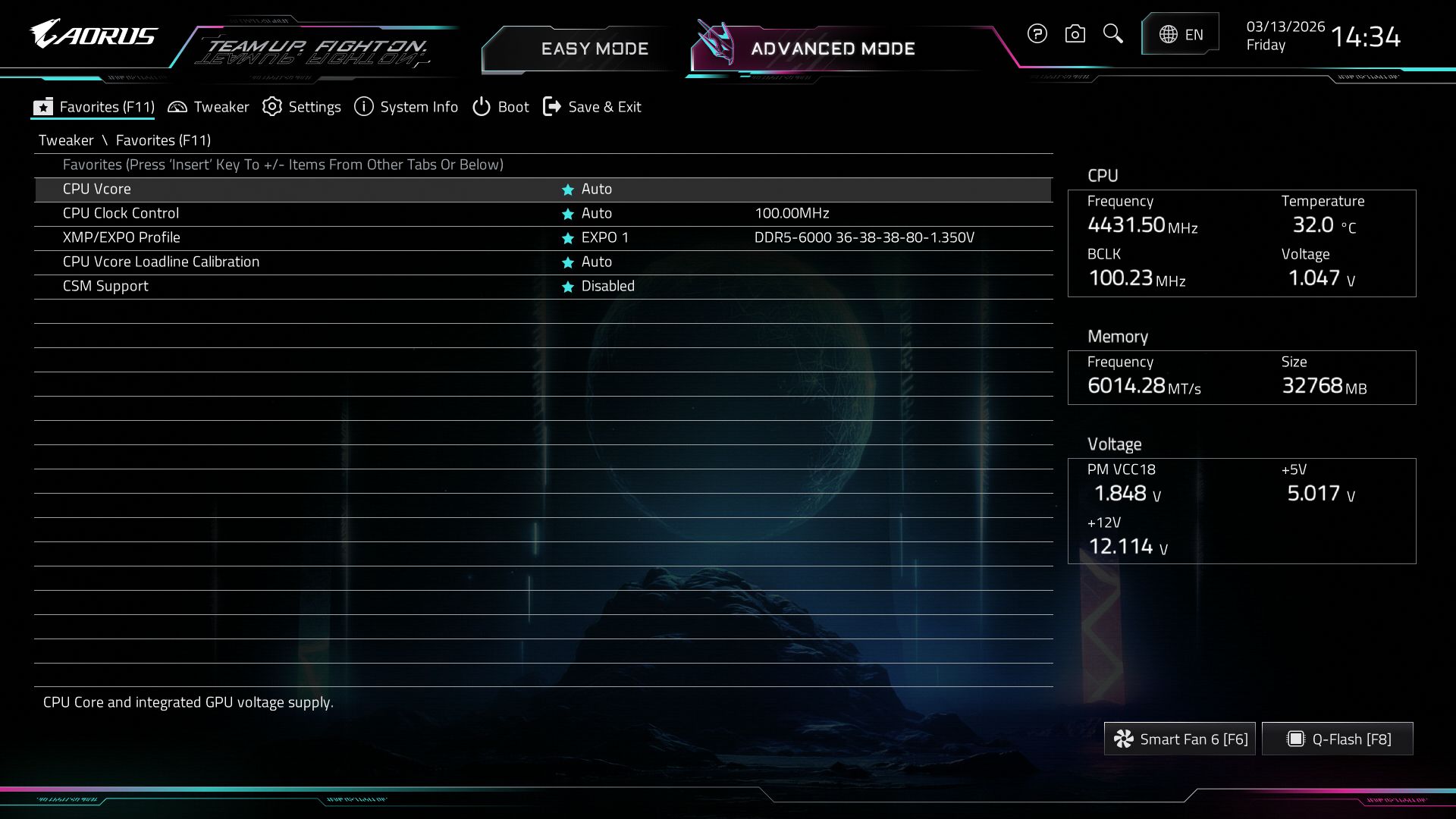 Новый «UC BIOS 2.0» от Gigabyte встречает нас логичным интерфейсом с кучей полезной информации прямо на главном экране (Easy Mode). Черный фон, голубые акценты и четкие белые шрифты — читается всё великолепно. В расширенном режиме вкладки сделаны в виде крупных кнопок, по которым удобно кликать мышкой. В общем, заблудиться в настройках сложно, а любимые параметры всегда можно вынести на отдельную страницу.