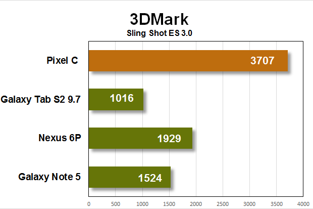 В тесте PCMark Work Performance Samsung Galaxy Tab S2 9.7 – логичный конкурент нашего планшета – получил неплохую оценку в 5840 баллов. Но Pixel C обходит его с еще большим результатом в 6711 «попугаев». Но самое интересное – игровой тест 3DMark (его результаты на нижней диаграмме). В этом случае Pixel C просто стирает конкурентов в порошок. Тест за тестом Pixel C заставляет рассматривать другие устройства на базе Android как устаревшие.
