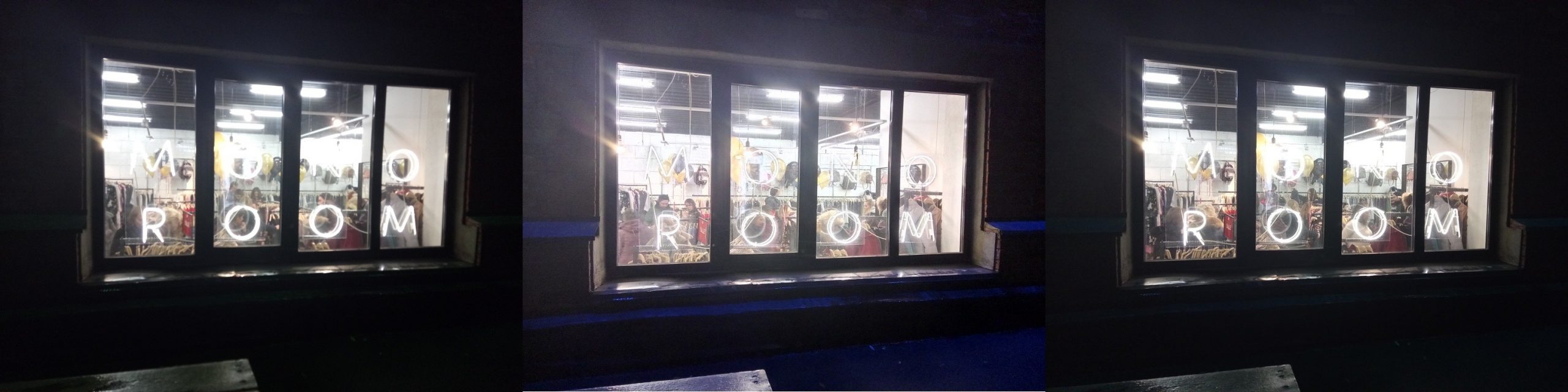 Ниже видим три снимка слева направо: в обычном режиме (смазанный), в режиме «Профессиональный» (лучший результат) и в режиме «HDR» (пересвеченное изображение с обилием бликов).