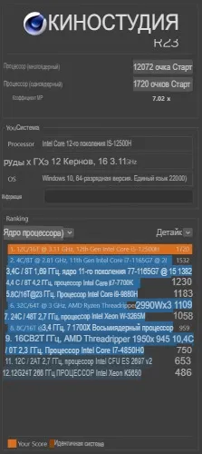 Переключившись на Cinebench R23, мы снова видим мощь новейшего чипа Intel. Он набрал 1 720 баллов в одноядерном тесте и 12 072 балла в многоядерном тесте. Сопоставимый Ryzen 7 6800H показал бы результат на 15% хуже в одноядерном тесте, хотя Ryzen по-прежнему имеет 8%-е преимущество над чипом Intel в многоядерном тесте.