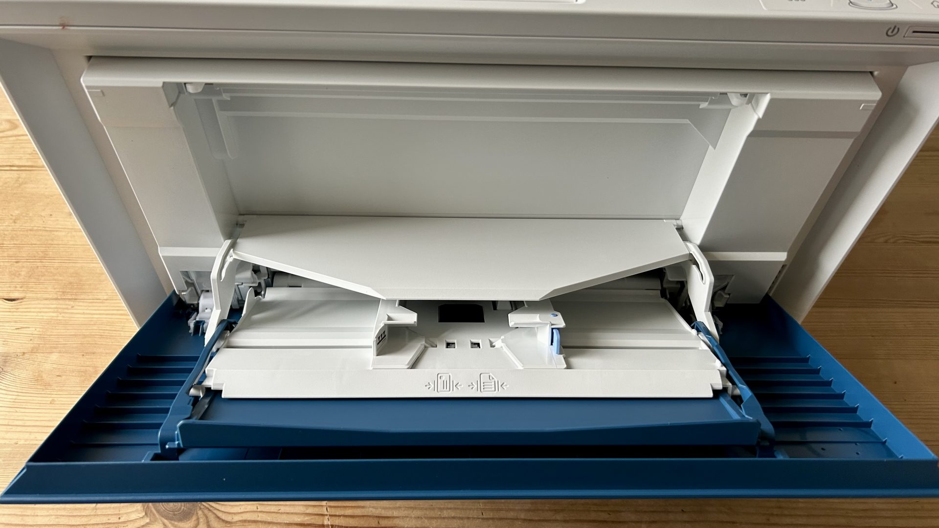 Нижний синий ящик вмещает до 250 листов бумаги формата Letter или A4, что является стандартным количеством, а синяя панель сверху открывает многофункциональный лоток на 50 листов, который более удобен, чем обычный лоток для одного листа. Верхний выходной лоток также глубже, чем у большинства подобных устройств, и вмещает до 150 листов.